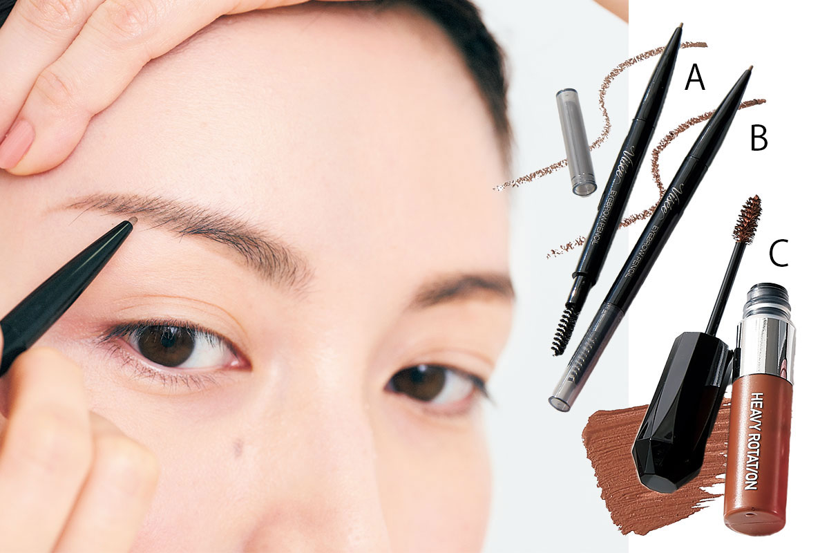 こめかみ部分の皮膚を引き上げて描くと、眉のラインが直線に近くなり皮膚のハリもアップするため描きやすく。Bのブラウンでアウトラインを、毛が足りない部分はAのグレー系で埋め、Cの眉マスカラを。
