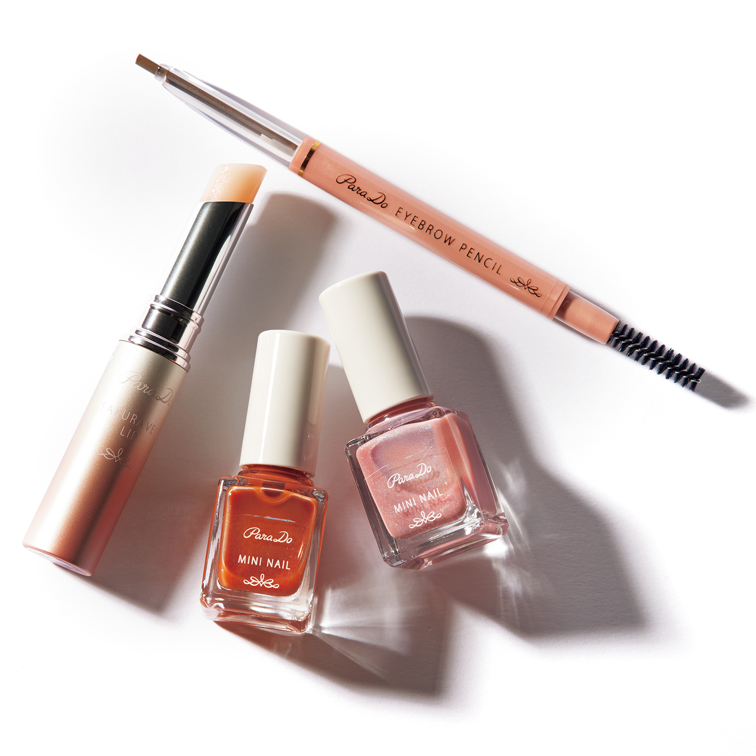 左から:保湿成分入りで桜色のふっくら唇に。サクラヴェールリップ PK01 ¥770、ワンシーズン使い切りのミニサイズ。ミニネイル OR07(左)PK20(右)各¥385、累計出荷数1,200万本突破! アイブロウペンシルN BR1 ¥770(すべてパラドゥ カスタマーセンター)