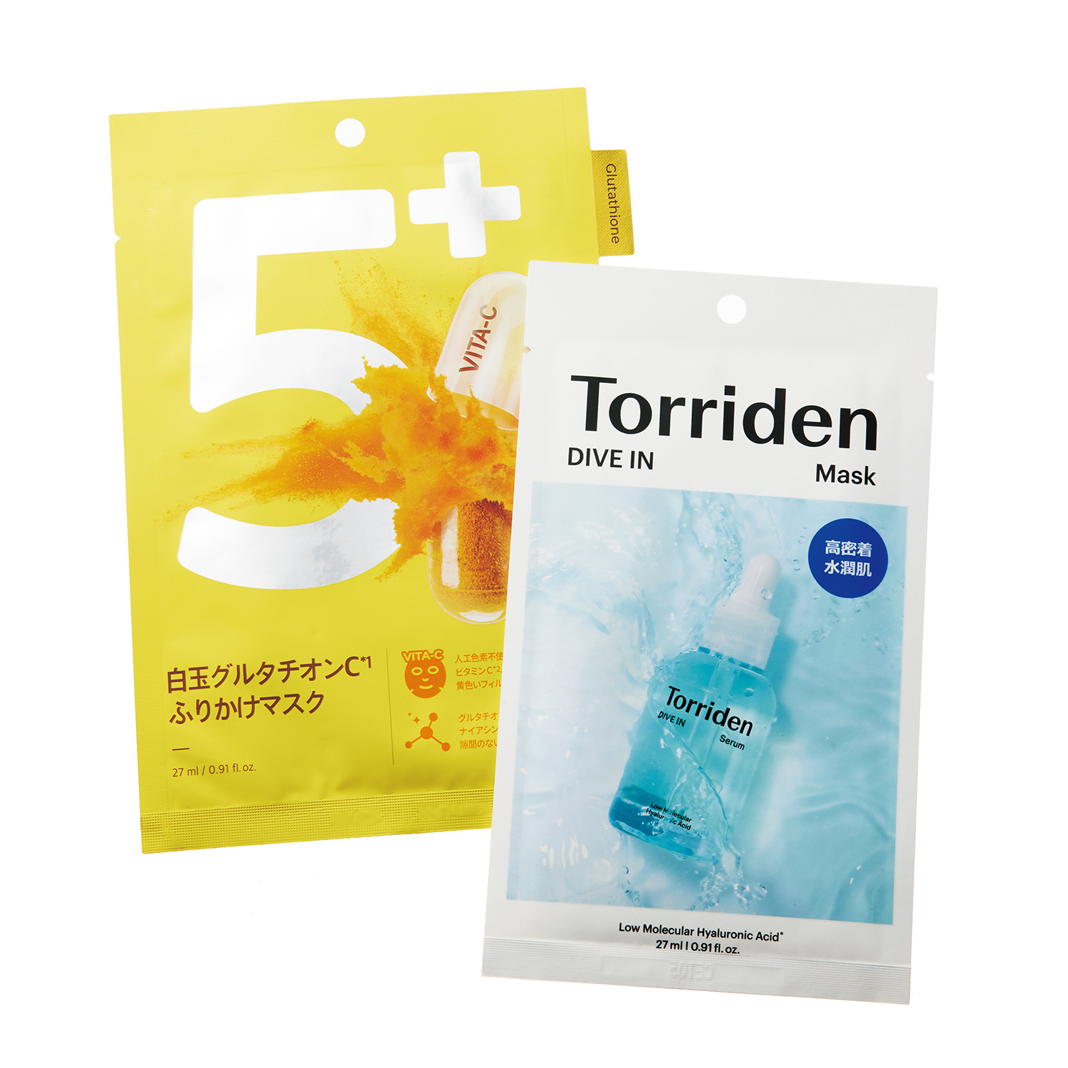 左:明るい透明美肌に導く高機能性美白マスク。numbuzin 5番 白玉グルタチオンC ふりかけマスク[1枚]¥290(BENOW)右:高保湿シートマスクで潤いチャージ。トリデン ダイブイン マスク[1枚]¥275(Torriden)