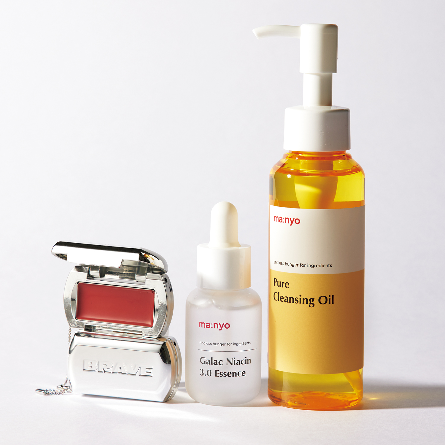 左から:アクセ感覚で持ち歩ける映えコスメ。BRAYEリップスリーク ミニ 03 ¥1,210(フードコスメ)天然由来成分配合で肌に優しい。ma:nyoガラク ナイアシン3.0エッセンス 20ml ¥1,980、同ピュア クレンジング オイル 100ml ¥1,650(ともにアイケイ)