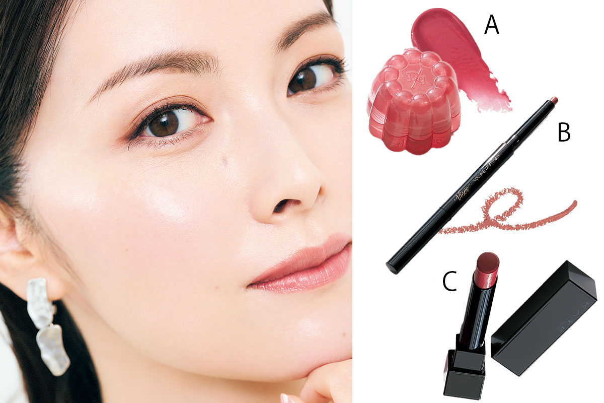 Aのチークを手の甲にとってから指で少しずつ頰に。ピンクベースカラーが◎。Bのリップライナーをリップ全体に。このひと手間でプチプラリップでも長時間品ある仕上がりをキープできます。Cのリップはラフに直塗り。
