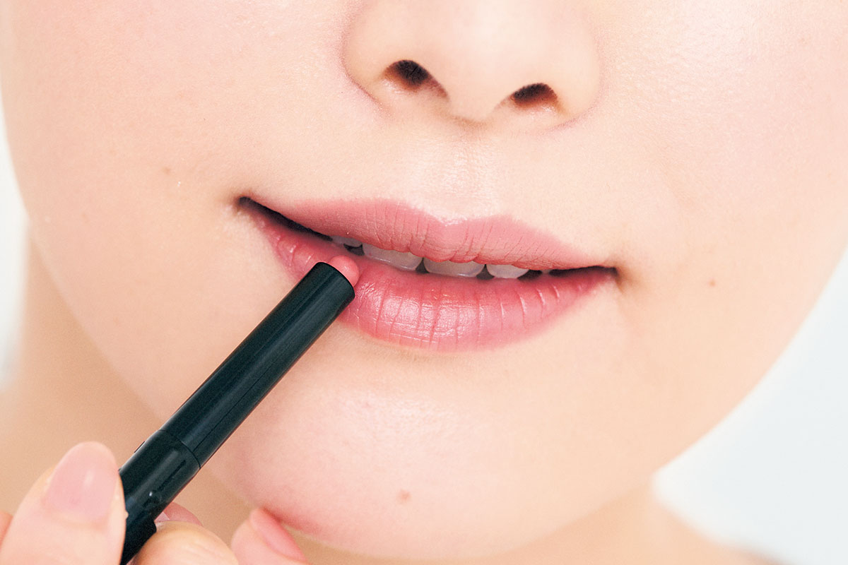 大人はペンシル必須。伸びのいいBのリップライナーで唇に下地を作っておくことでリップの色ムラも補整でき、落ちても上品に。