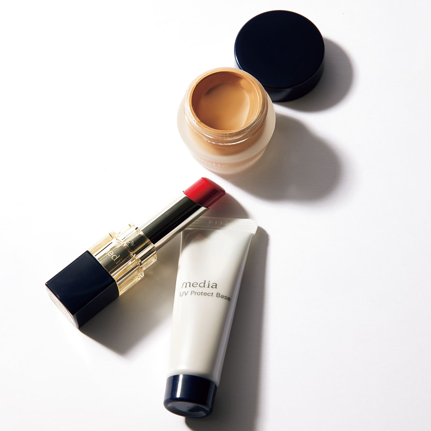 上から:大人の肌悩みをしっかりカバー。クリームファンデーション N<ミニ>10g ¥550、顔色をパッと明るく。ブライトアップルージュ RD05<ファミリーマート限定色>¥1,210、トーンアップ下地。UV プロテクトベース R<ミニ>10g ¥550(すべてカネボウ化粧品)※取り扱いのない店舗あり