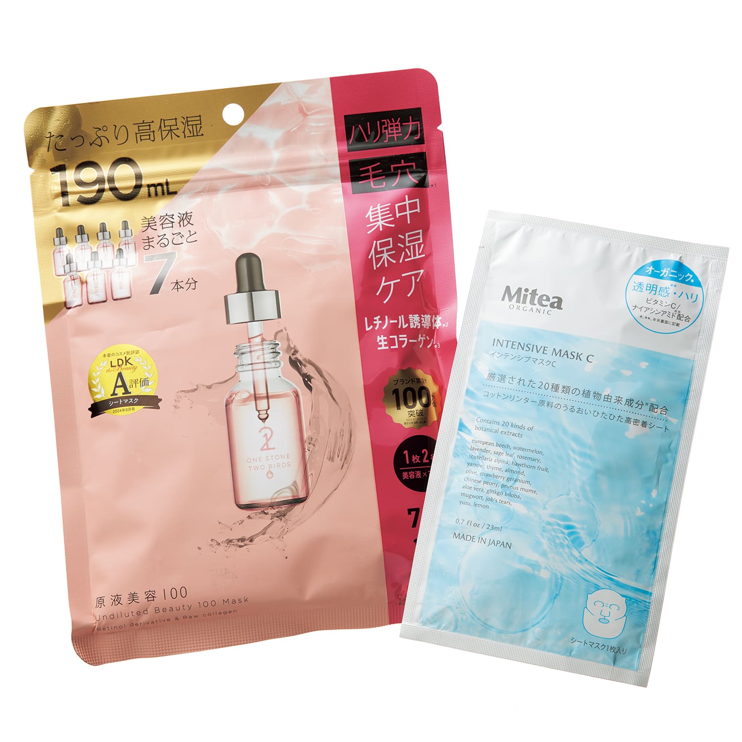 左:濃厚保湿集中ケアマスクでハリ肌に。ONE STONE TWO BIRDS 原液美容100マスク レチノール&コラーゲン[7枚]¥698(b&W)右:速攻集中保湿のマスク。インテンシブマスクC[1枚]¥352(Mitea ORGANIC)