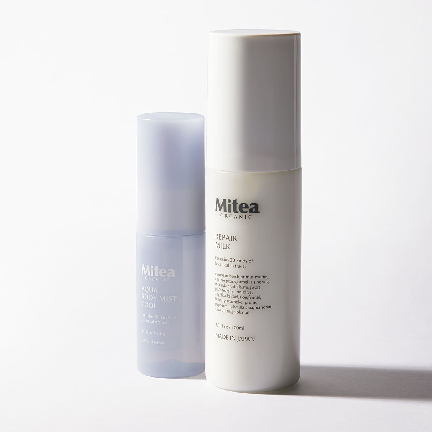 左:ボディ用化粧水。アクアボディミスト クール 30ml ¥1,320(数量限定)右:4月発売のオールインワン乳液が大ヒット!リペアミルク 100ml ¥1,991(ともにMitea ORGANIC)※取り扱いのない店舗あり