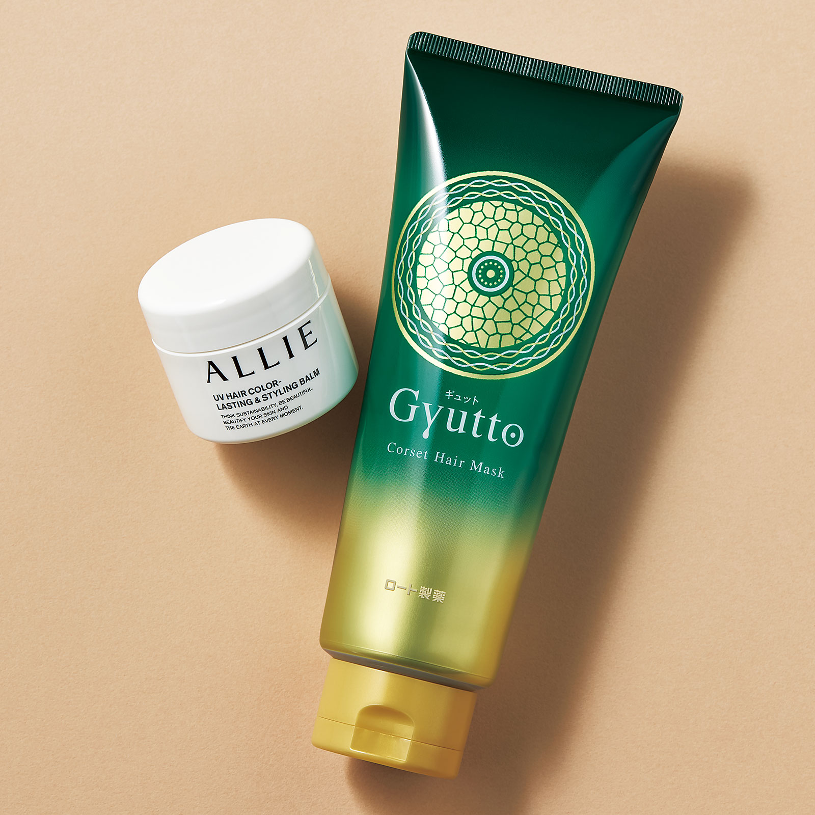 右・大人のうねり髪に効果的。ギュット コルセットヘアマスク¥1,485(ロート製薬)紫外線をカット&髪の色落ちを防ぐ。