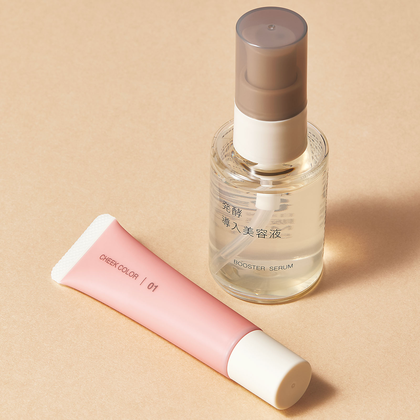 左・みずみずしいテクスチャー。肌になじんで自然なツヤ感をプラス。クリームチーク アプリコット ¥990(ともに無印良品)