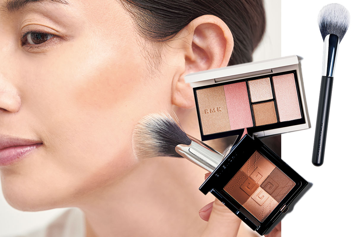 上:〈モデル使用〉パレットの左のコントゥアリングカラーを使用。RMK シェイド & グロウ フェイスパレット01¥7,700(RMK Division)下:色を自在にブレンドして理想の小顔に。プリズム・リーブル・ブロンザーパウダー[フェイスパウダー]001¥7,480(パルファム ジバンシイ)