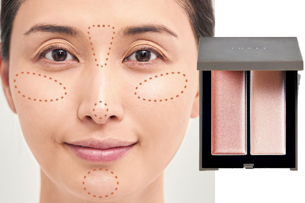 パレット右のハイライトを眉間、鼻先、両頰、顎先にのせます。眉間から顎先までの縦のラインを強調するとシャープな立体感が。