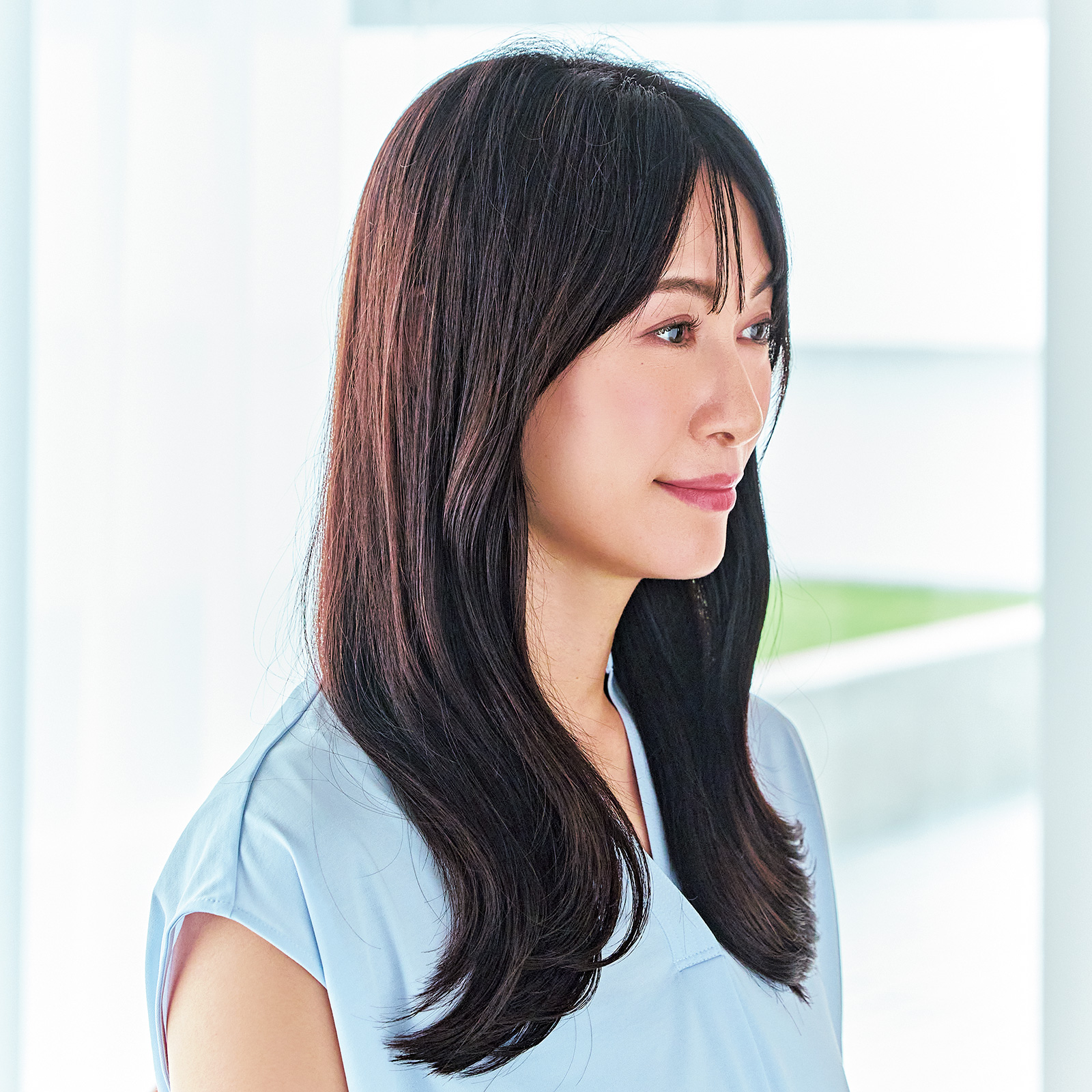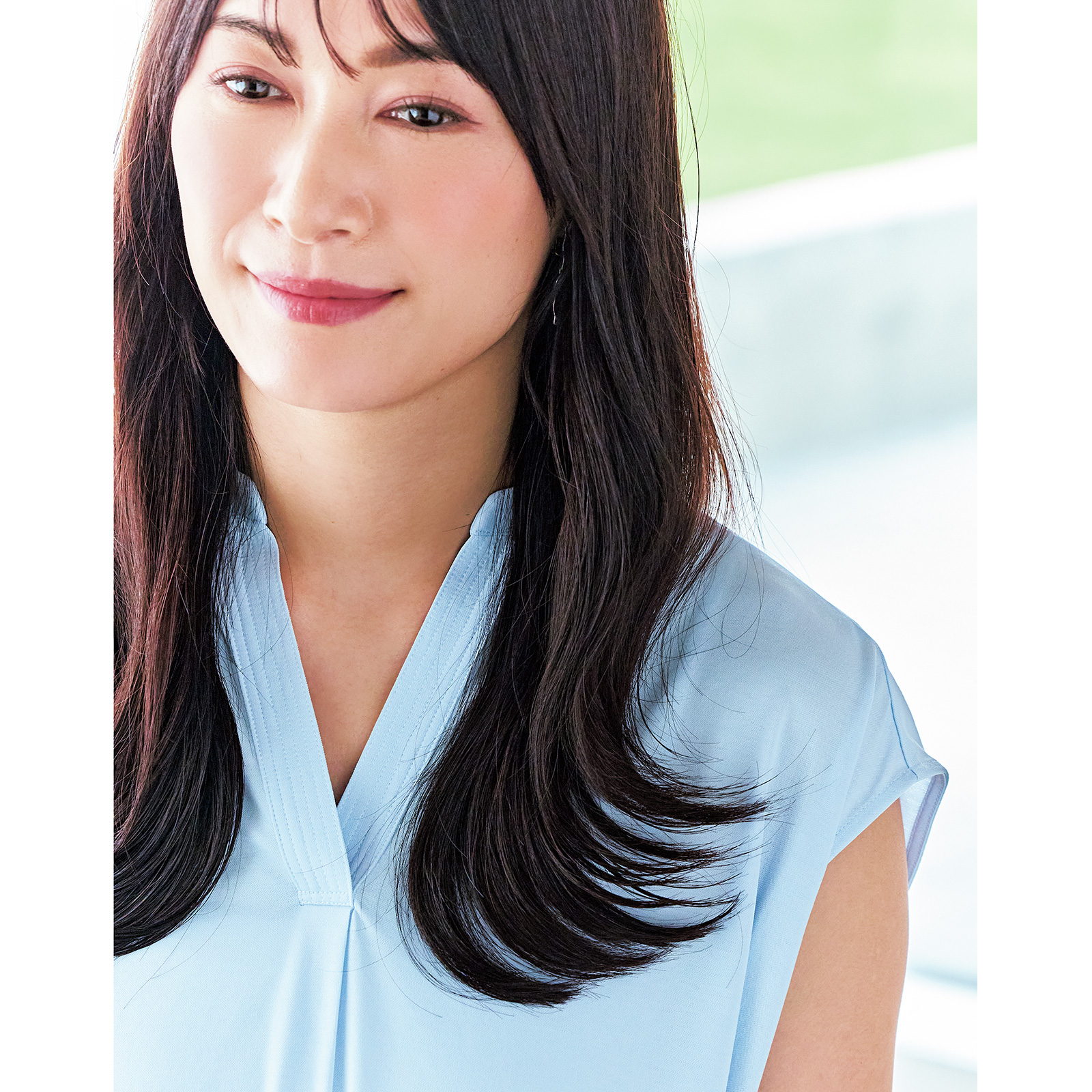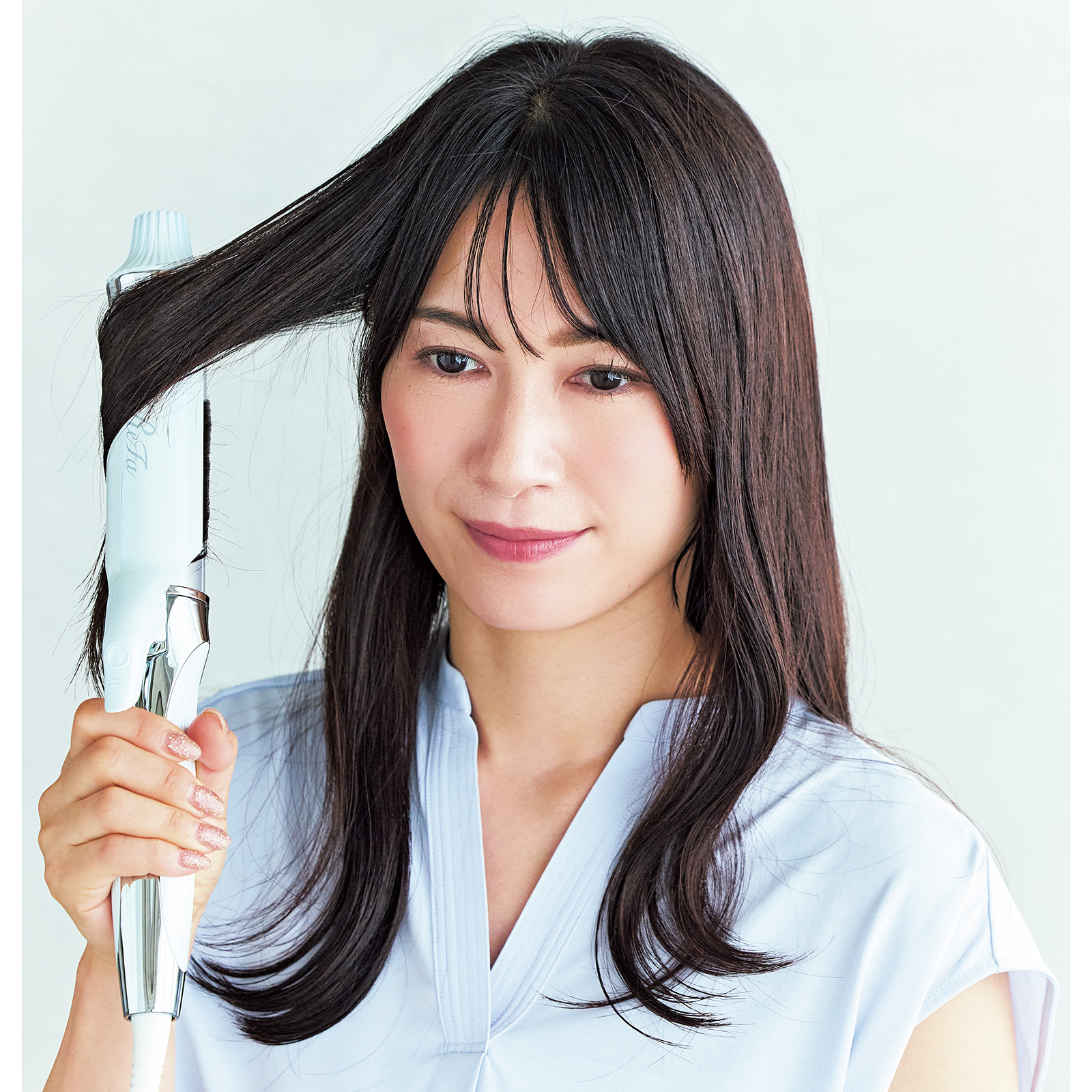 「ロングの黒髪をただストレートに下ろしていると重く見えるだけです。長さはそのままでよいので、リップくらいの高さからレイヤーを入れて軽くすることが何よりも大切。軽くなった毛先をトレンドの外ハネに仕上げたら、一気にあか抜けるのでマイナス5歳見えが叶います!」