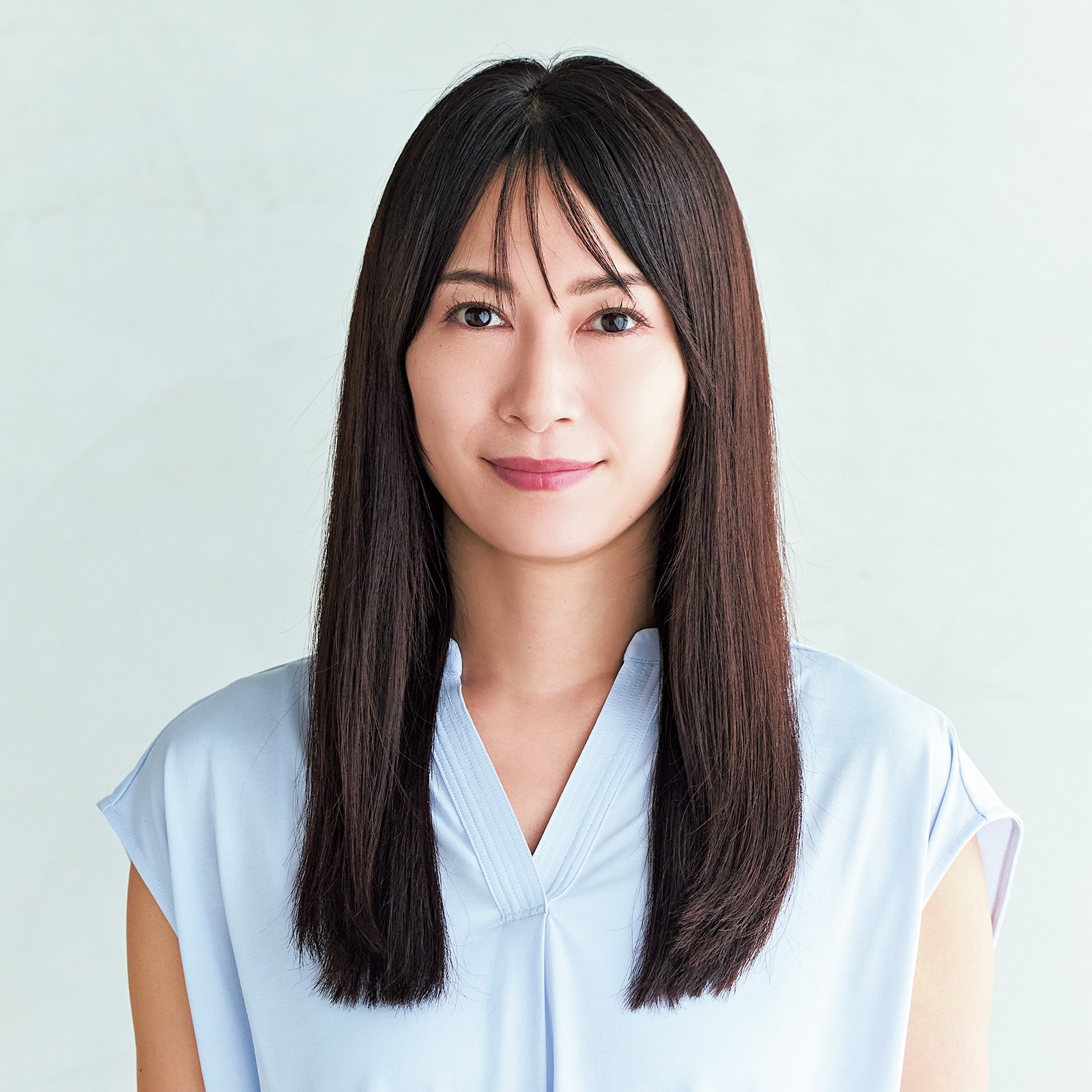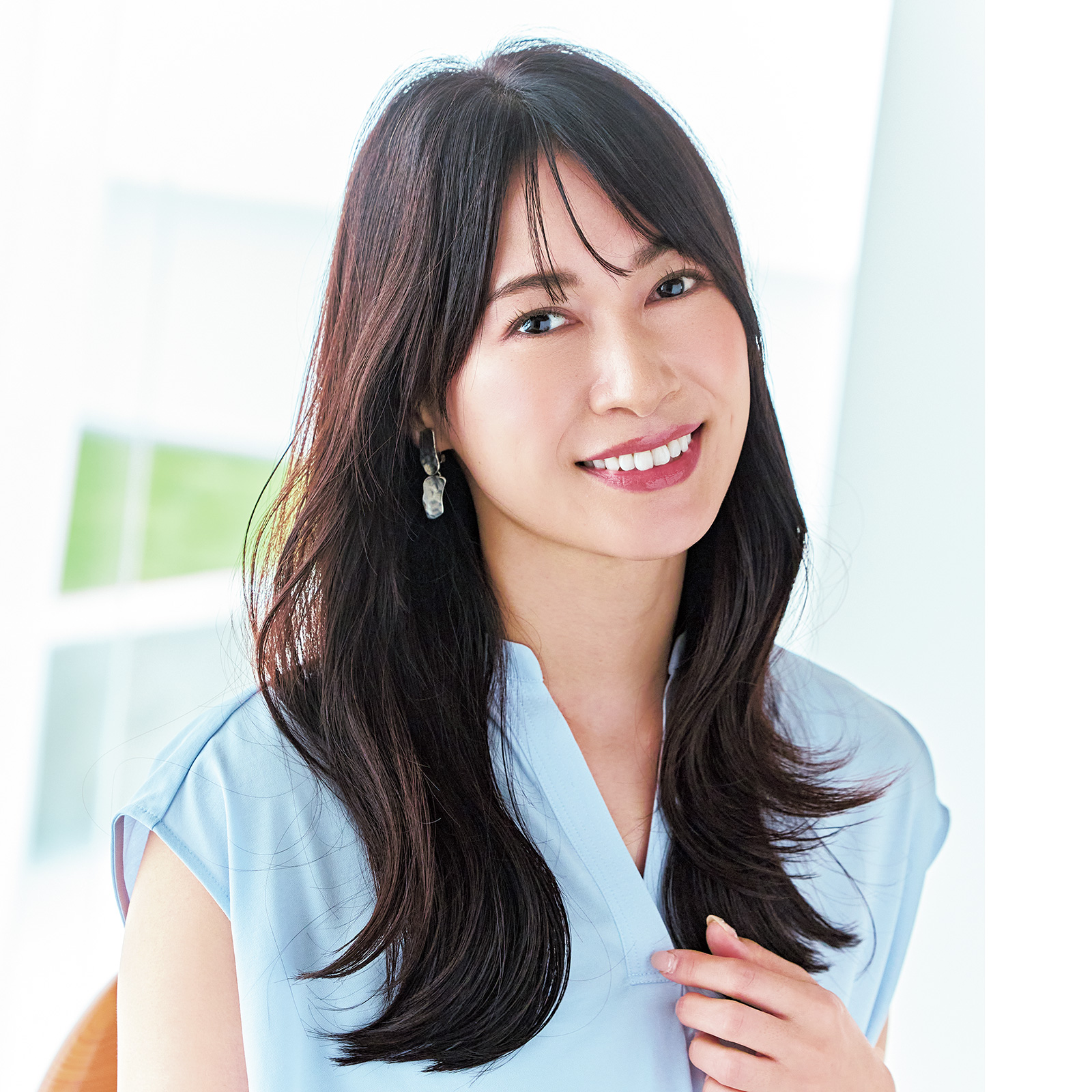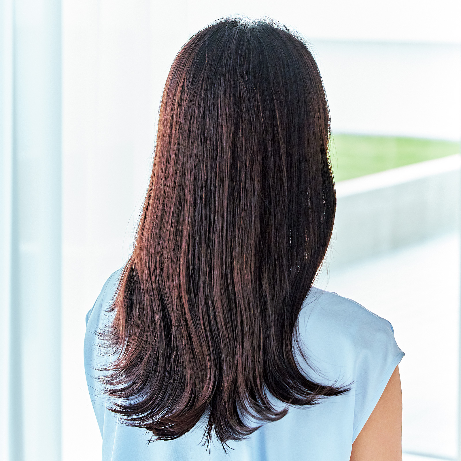 「ロングの黒髪をただストレートに下ろしていると重く見えるだけです。長さはそのままでよいので、リップくらいの高さからレイヤーを入れて軽くすることが何よりも大切。軽くなった毛先をトレンドの外ハネに仕上げたら、一気にあか抜けるのでマイナス5歳見えが叶います!」
