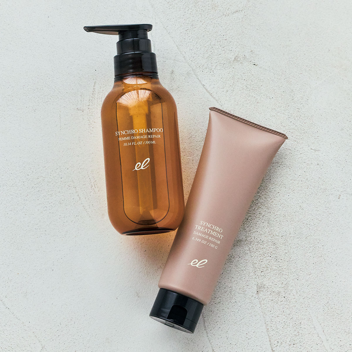 左:加齢とともに変化する大人髪に内外からアプローチし、髪本来の美しさを取り戻す集中補修ケア。エレクトロン シンクロシャンプー ファム ダメージリペア 300ml ¥3,740 (GMコーポレーション)右:エレクトロン シンクロトリートメント ダメージリペア 180g ¥3,080(GMコーポレーション)