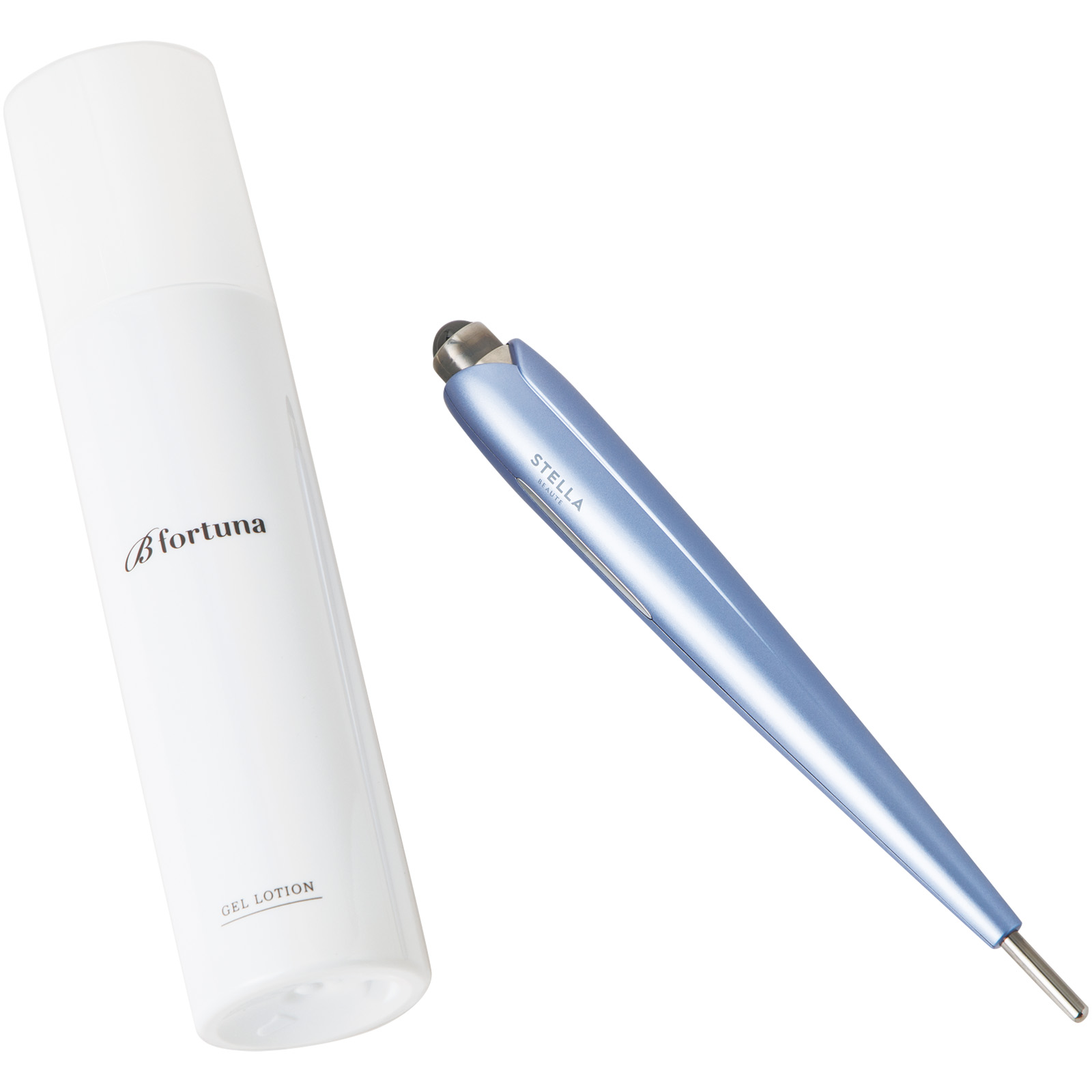 「摩擦レス美顔器にクッション性のあるジェルを併用。機器で温めて筋膜をほぐしてから行うとより効果的」(左)B fortuna TOKKOゲルローション 150ml ¥3,300(Salon De TOKKO)(右)Beauty Face Stick Rin ¥28,000(STELLA BEAUTE)