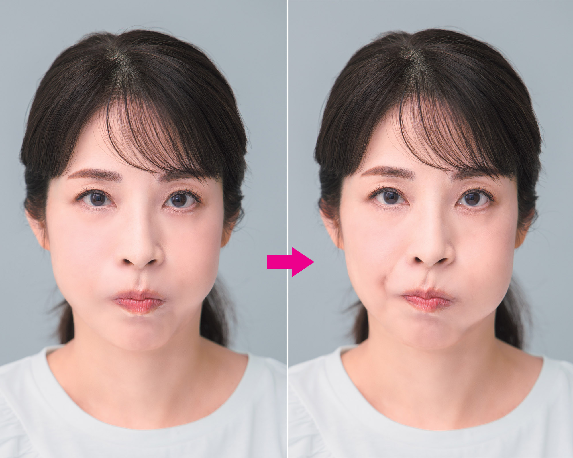 まずは口腔内に空気を含ませてパンと張った状態に。人中裏→右頰→左頰の順に表皮が張るくらい膨らませて5秒キープ。1日1〜3分、3セット、肌をたっぷり保湿した後に組み込んで表情筋のストレッチを。