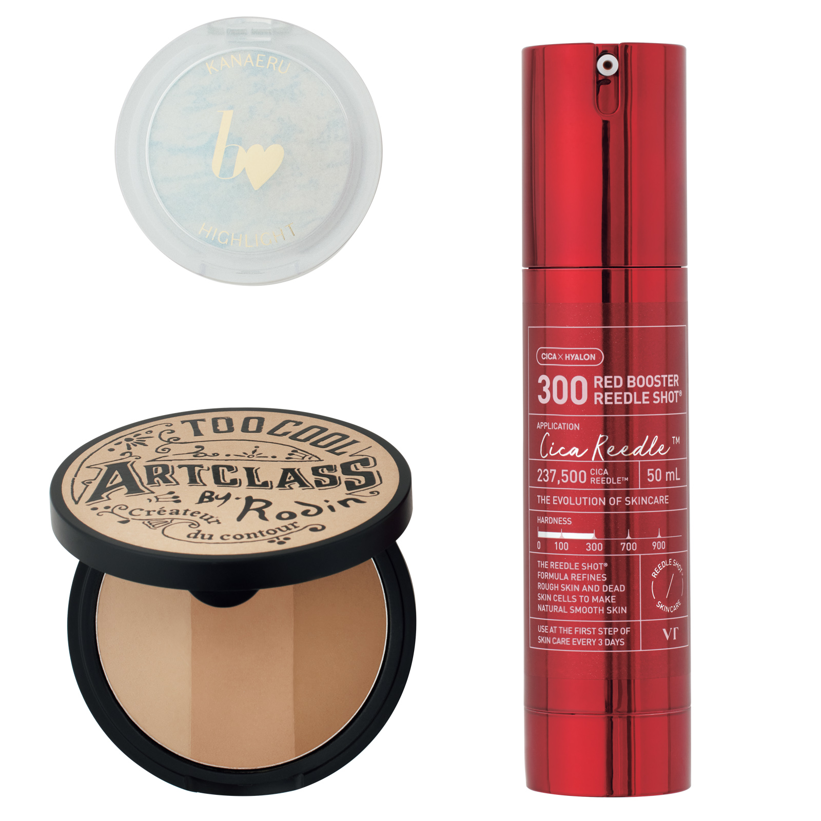 左上・【保湿成分配合でシアーなハイライト】 b idolの叶えるハイライト02 は鼻先、唇上、顎先に。左下・【自然になじんで強すぎないカゲ色】トゥークールフォースクールのシェーディング 1 は大きなブラシでつけて顔を引き締め。右・【韓国でも話題のVTブースター】VT レッドブースターは韓国の女医さんの友人からのプレゼント。翌朝毛穴がキュッとします!