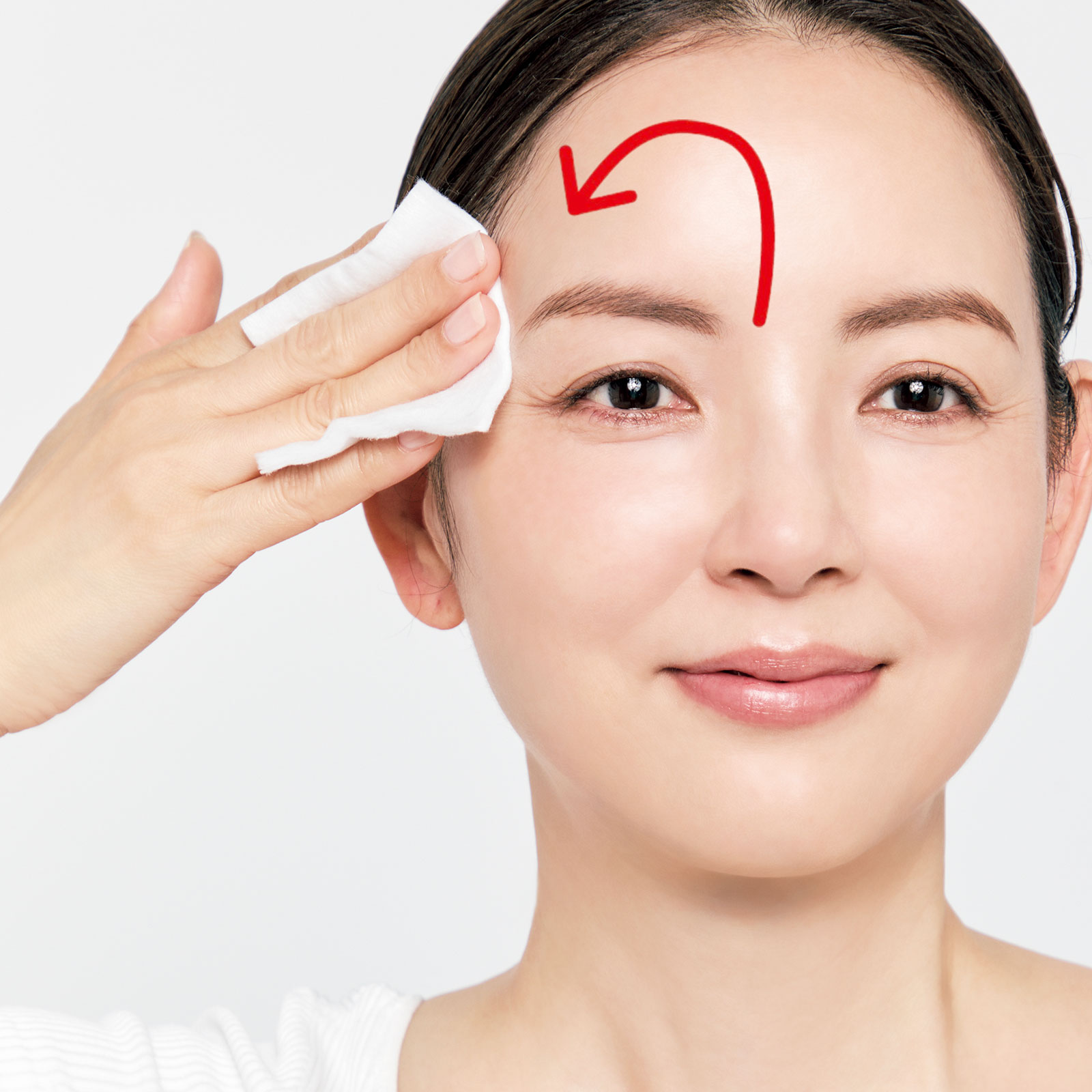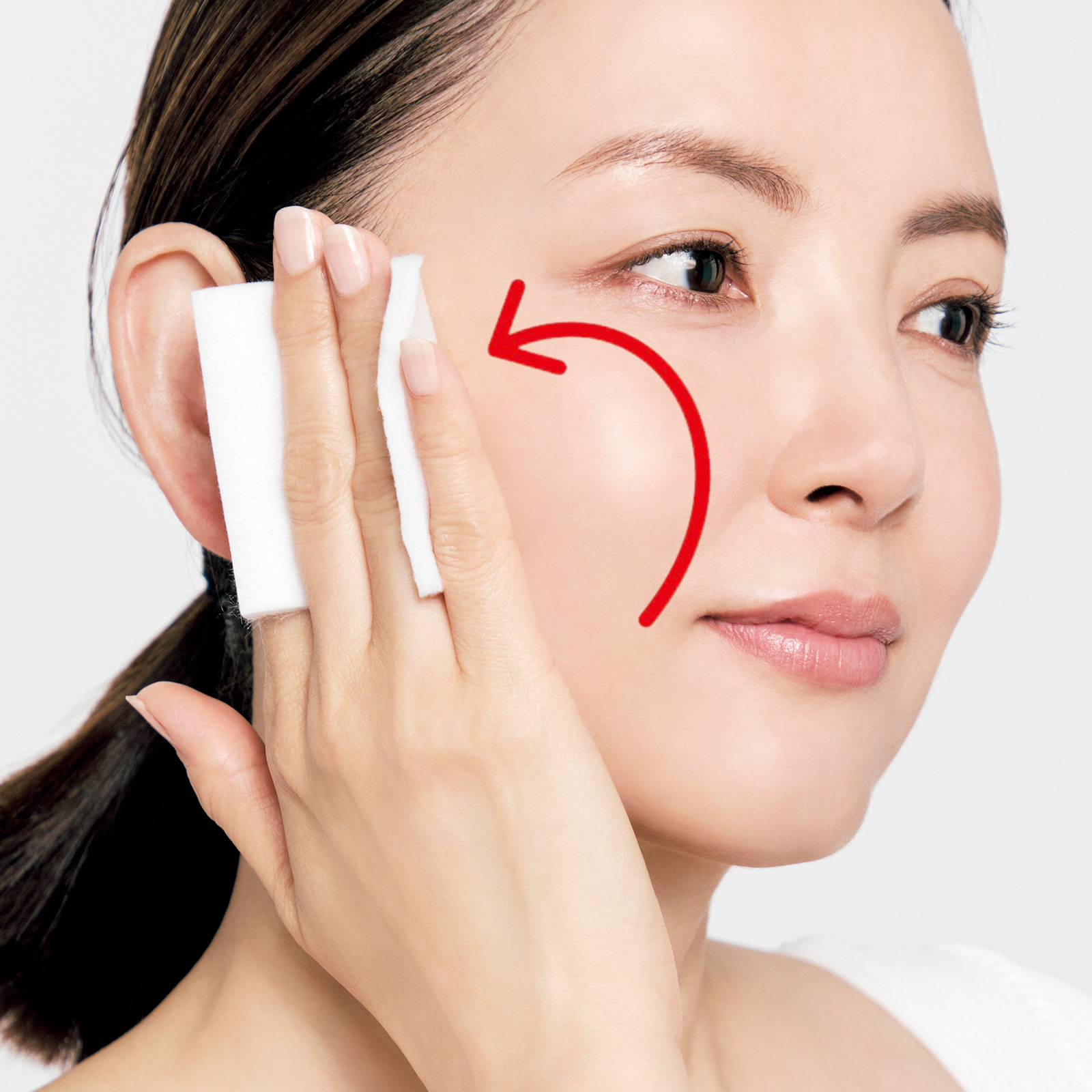 2.コットンは指を顔の丸みに合わせてフィットさせたまま動かす。ムラづきを防げ、潤いが行き渡る。