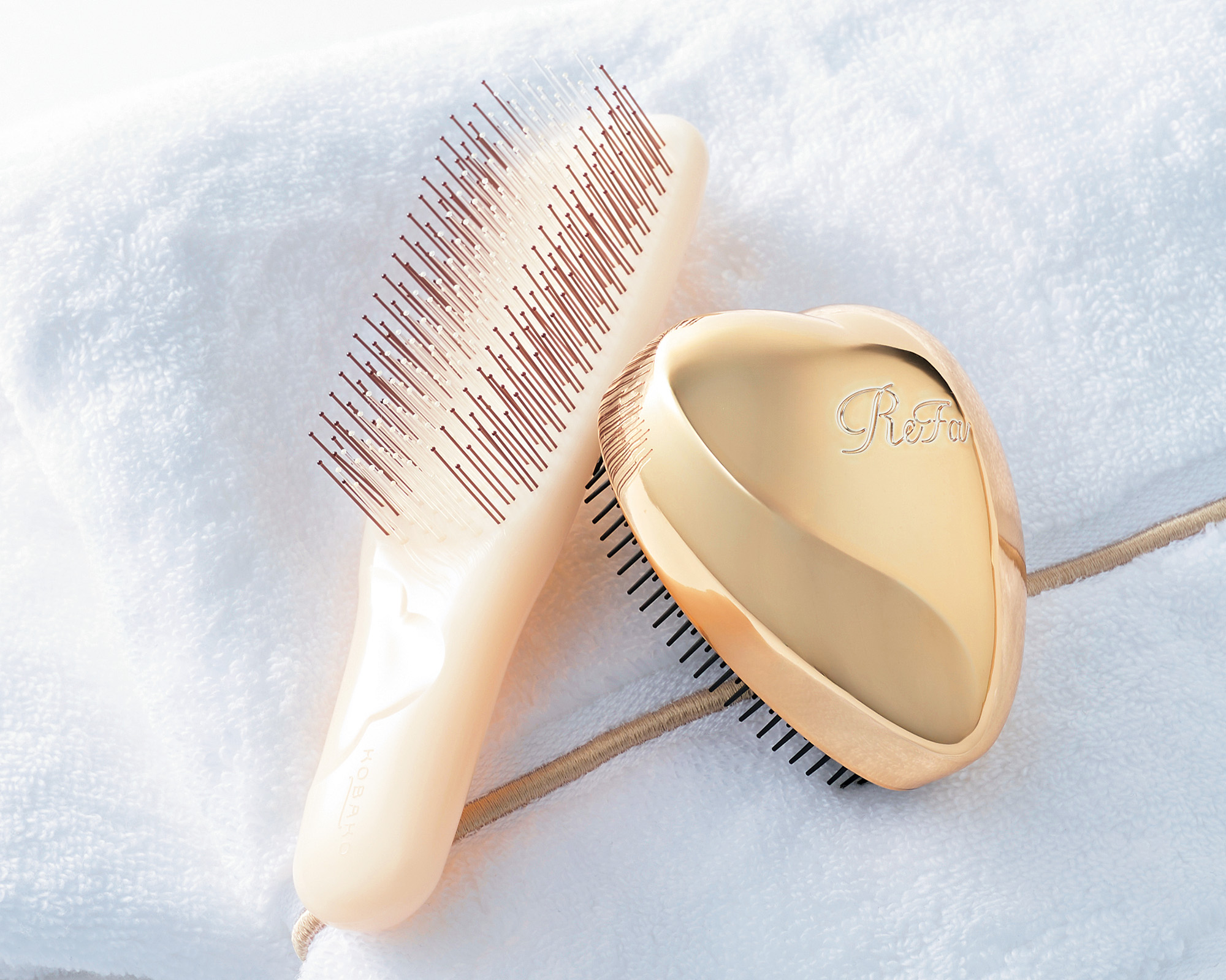 「洗髪前は心地よく頭皮を刺激するKOBAKOブラシで汚れを落として湯洗、ドライ前はReFaのハートブラシでとかすとまとまりやすくなります」(左)KOBAKO ヘアスムースブラシ(ソフト)¥3,080(貝印)(右)ReFa HEART BRUSH¥2,970(MTG)