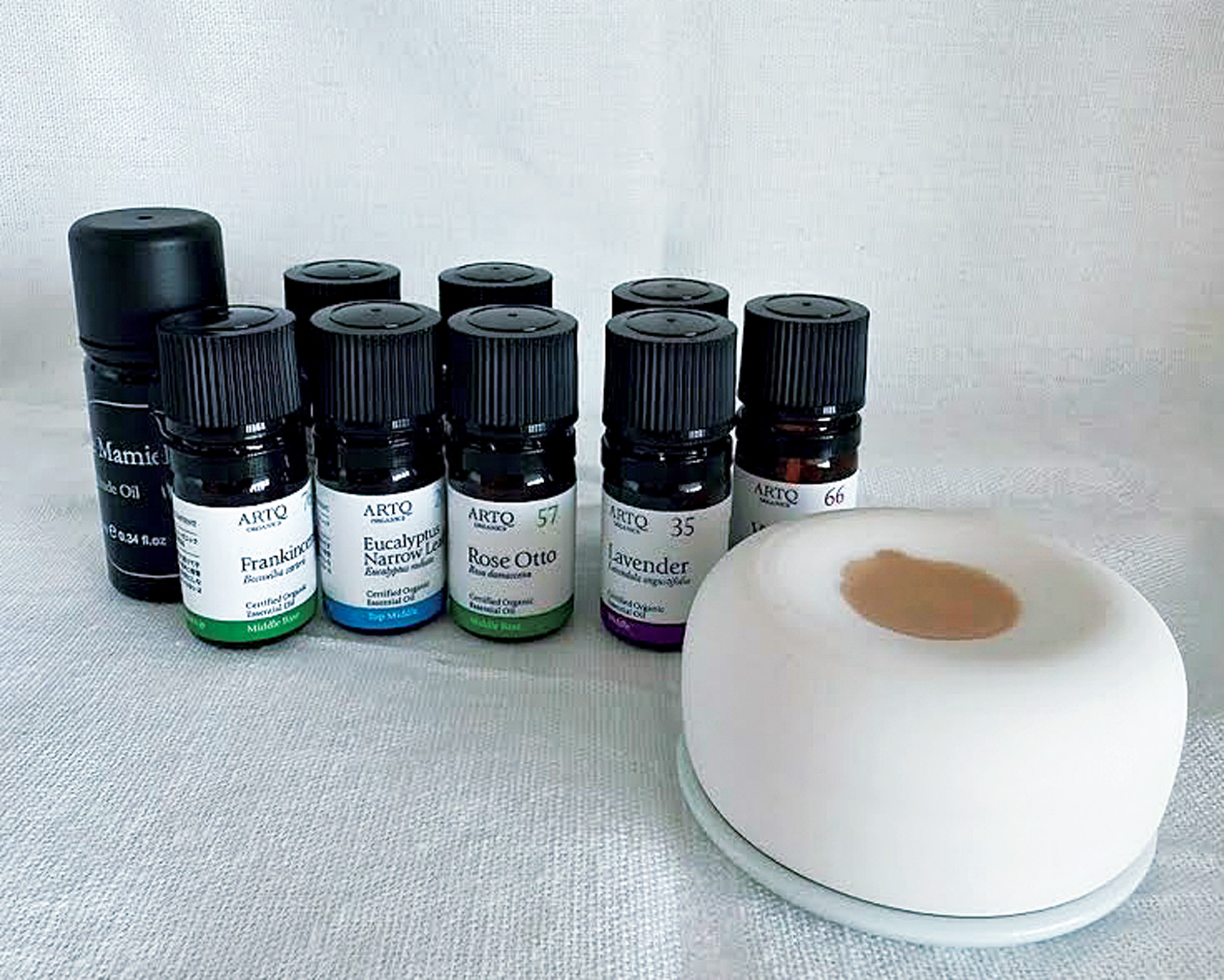 「自宅ではいろいろな精油をアロマストーンに垂らして香らせます。夜はローズ系、朝はレモングラスやユーカリなどで爽やかに」(精油、アロマストーンは本人私物)