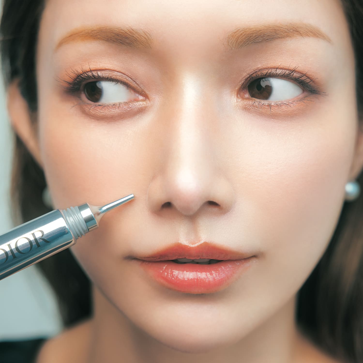 ディオールスキン フォーエヴァー フルイド グロウで仕立てた潤いあるツヤ肌に、同グロウ ルミナイザー 03で透明感とほのかな発光感をオン。目元はディオールショウ サンク クルール 429でピンクベージュグラデ、リップはディオール アディクト リップ マキシマイザー 026のモーヴピンクでふっくらと。ヘルシー&センシュアルに。