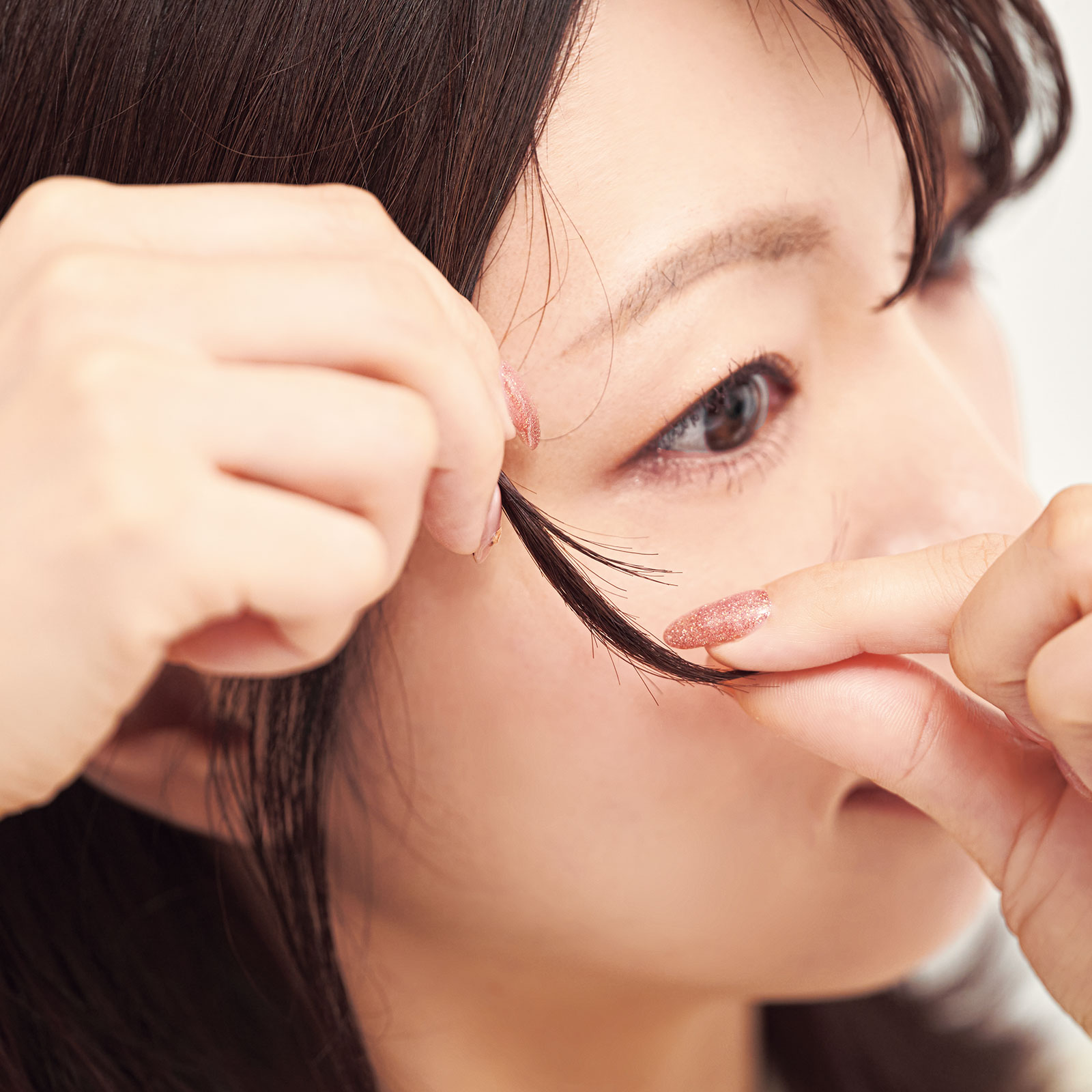 前髪にも軽くオイルをつけたら、サイドの髪をとり、頰にかかるように調整を。動きがあると奥行きが出て顔の凹凸も自然と強調されます。