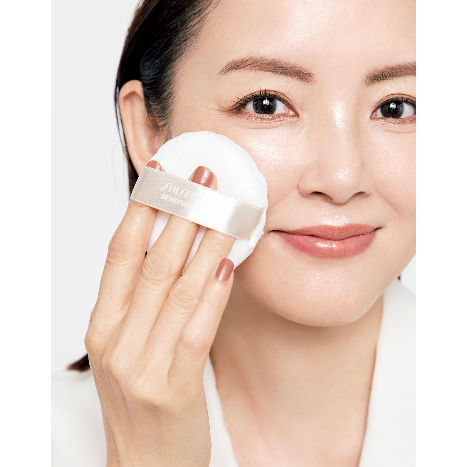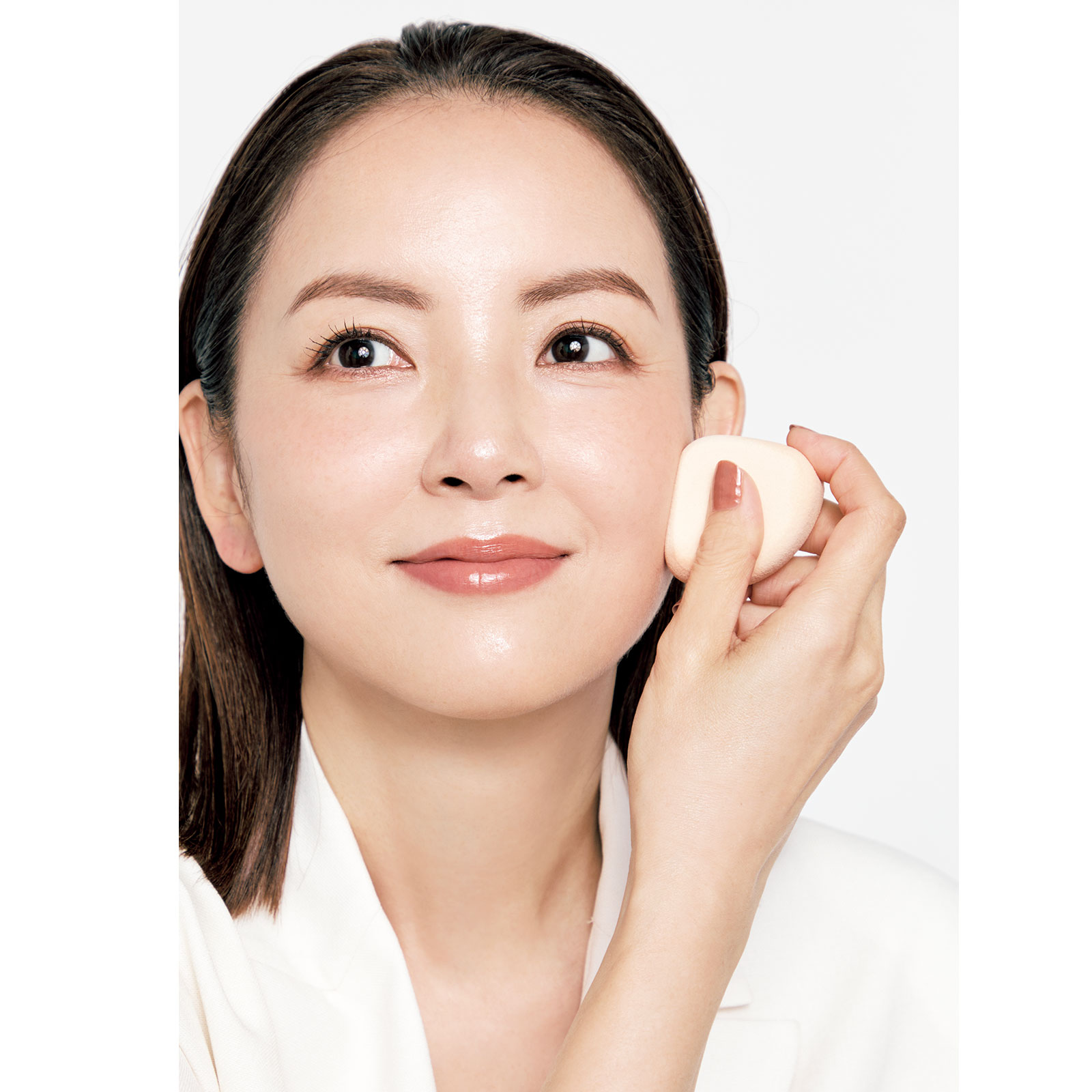 パフにパウダーをつけたらよく揉みこみ、肌に対して垂直に、毛穴に押し込むようにしてつけます。ムラにならないよう、すべらせるのは禁止。