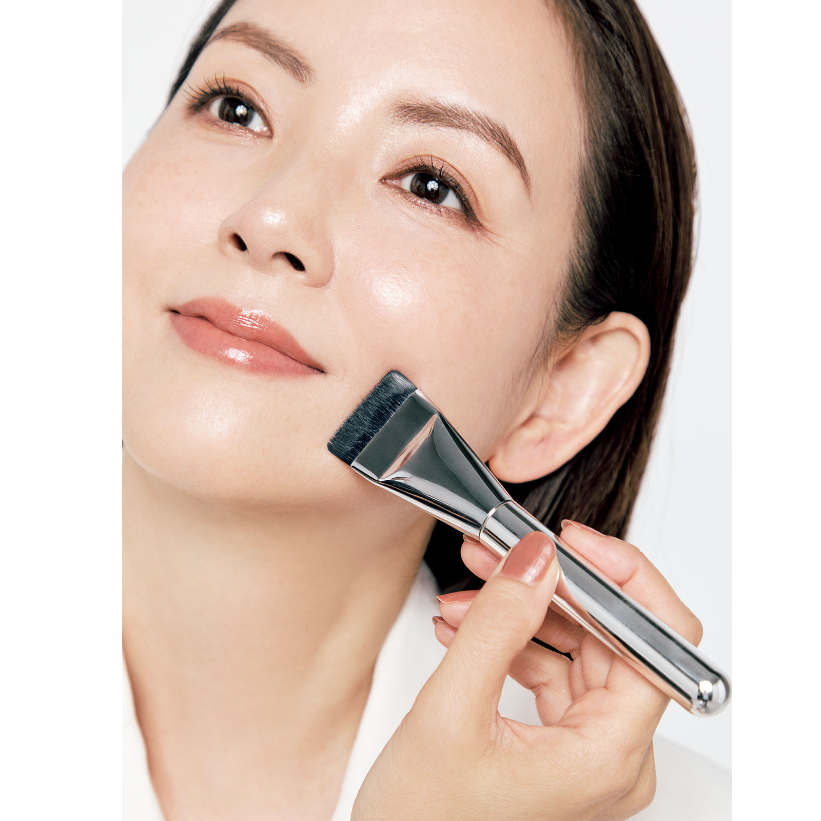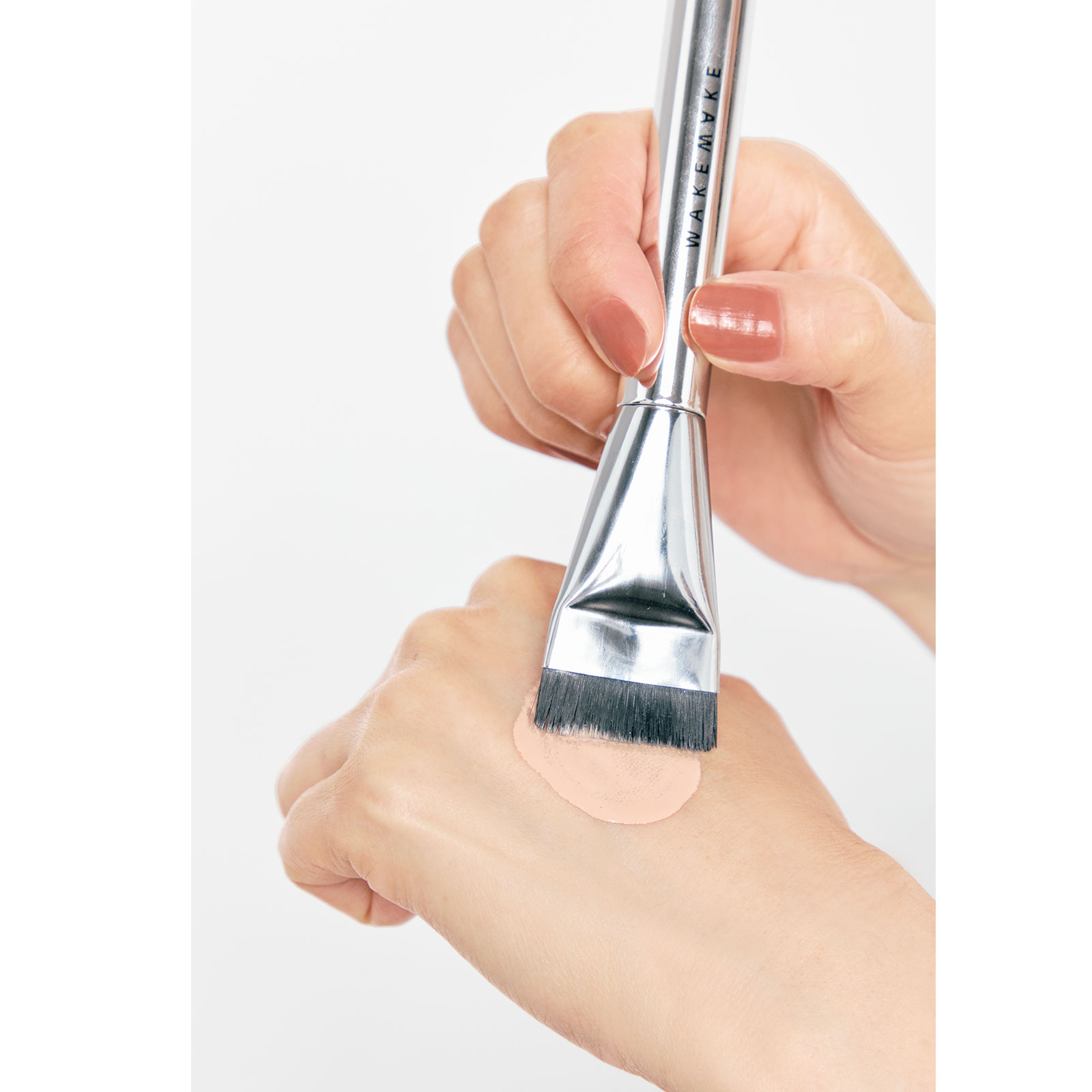 下地とファンデーションをほんの少量出し、手の甲の上で混ぜます。それをブラシに含ませ、保湿した部分に薄膜を重ねるように塗ります。