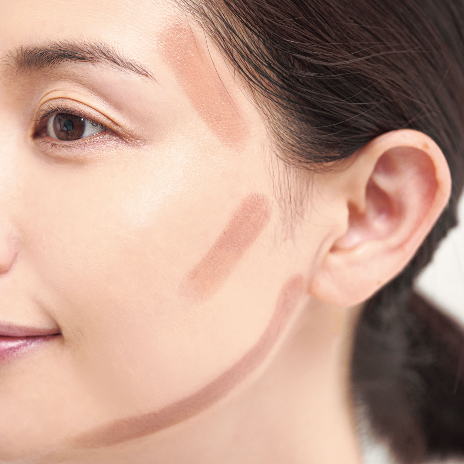 耳下からあご先にかけてのフェイスラインがくっきりとシャープなラインであることが大切ですが、シェーディングが悪目立ちするのはナンセンス。ベースメイクだけでなくパーツにもひと工夫して光と影を上手に操りましょう。