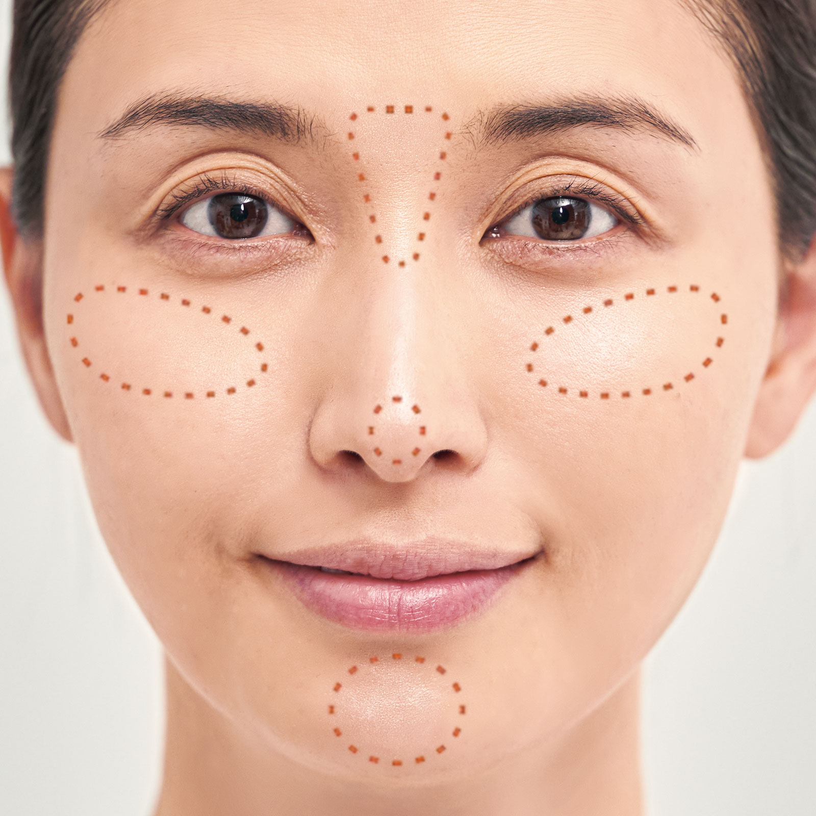 こめかみから耳上、もみあげ中央から頰骨のライン、耳下から顎先、さらに眉頭下のくぼみと下唇の下中央にのせ、外に向かって指でぼかします。