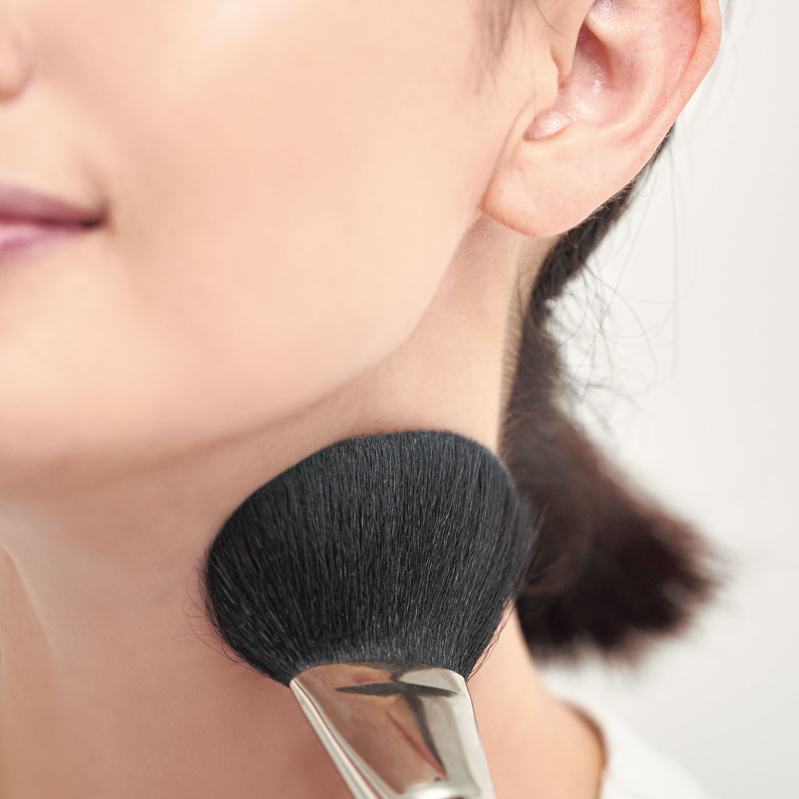 パウダーは、顔だけでなく顎下~首にものせれば、顔だけ浮くということがありません。大きめのブラシにたっぷりと含んで塗って。