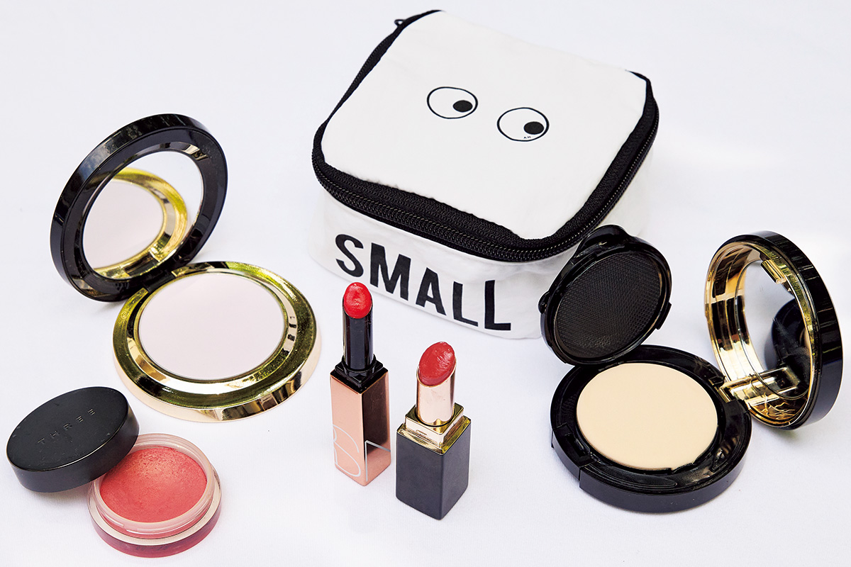 短時間の外出でもUV対策は徹底。下地もUV効果のあるSHISEIDOのエッセンス スキングロウ プライマーを愛用。ボディ用には無印の日焼け止めジェル。さらに、友人に教えてもらったイニスフリーのノーセバム ミネラルパウダー NをON。一日中さらスべ肌に。