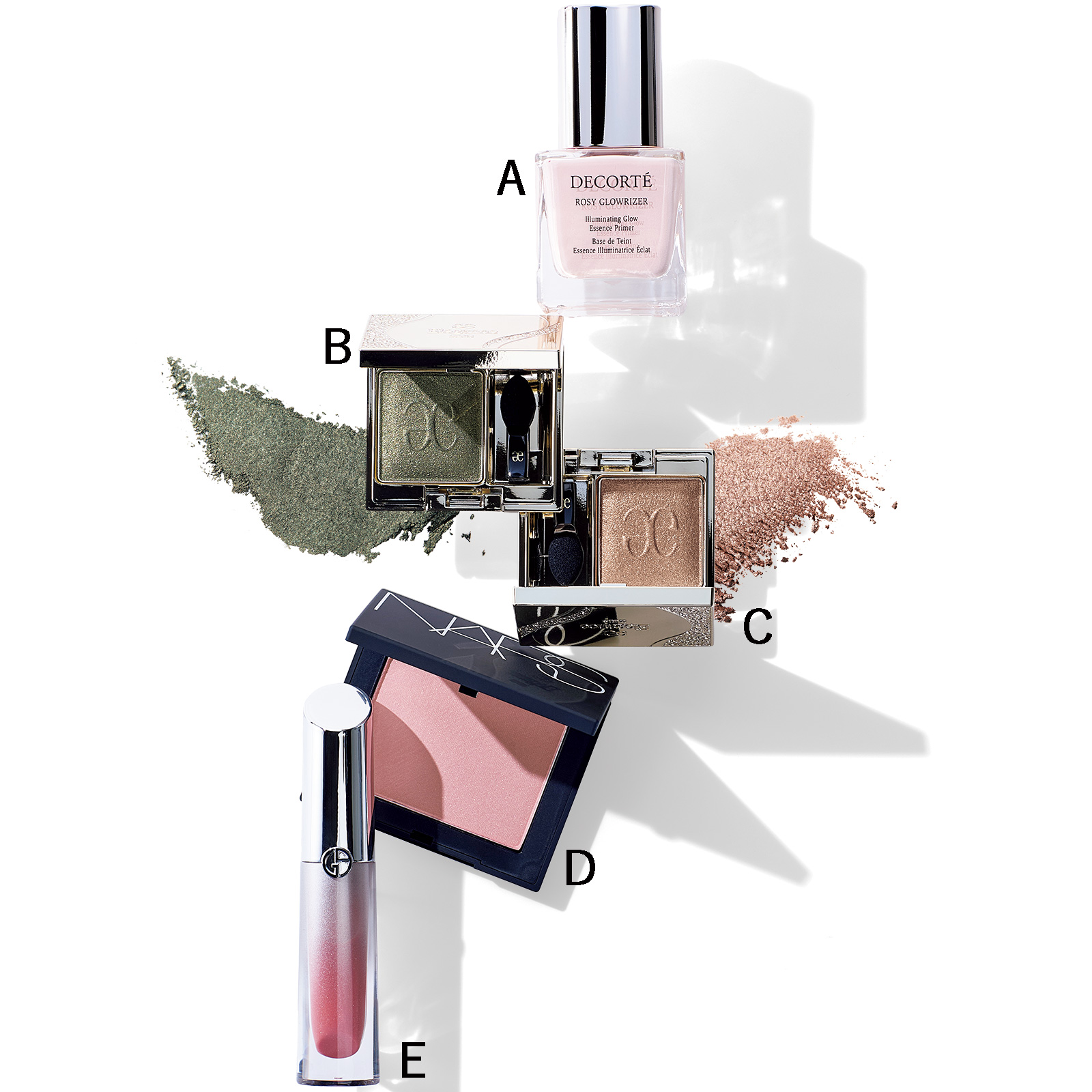 A.みずみずしいツヤをプラス。5点置きしてのばし、トーンアップ&艶やかに。ロージー グロウライザー + SPF15/PA++ 30ml ¥4,950(コスメデコルテ)<公式サイトをチェック>