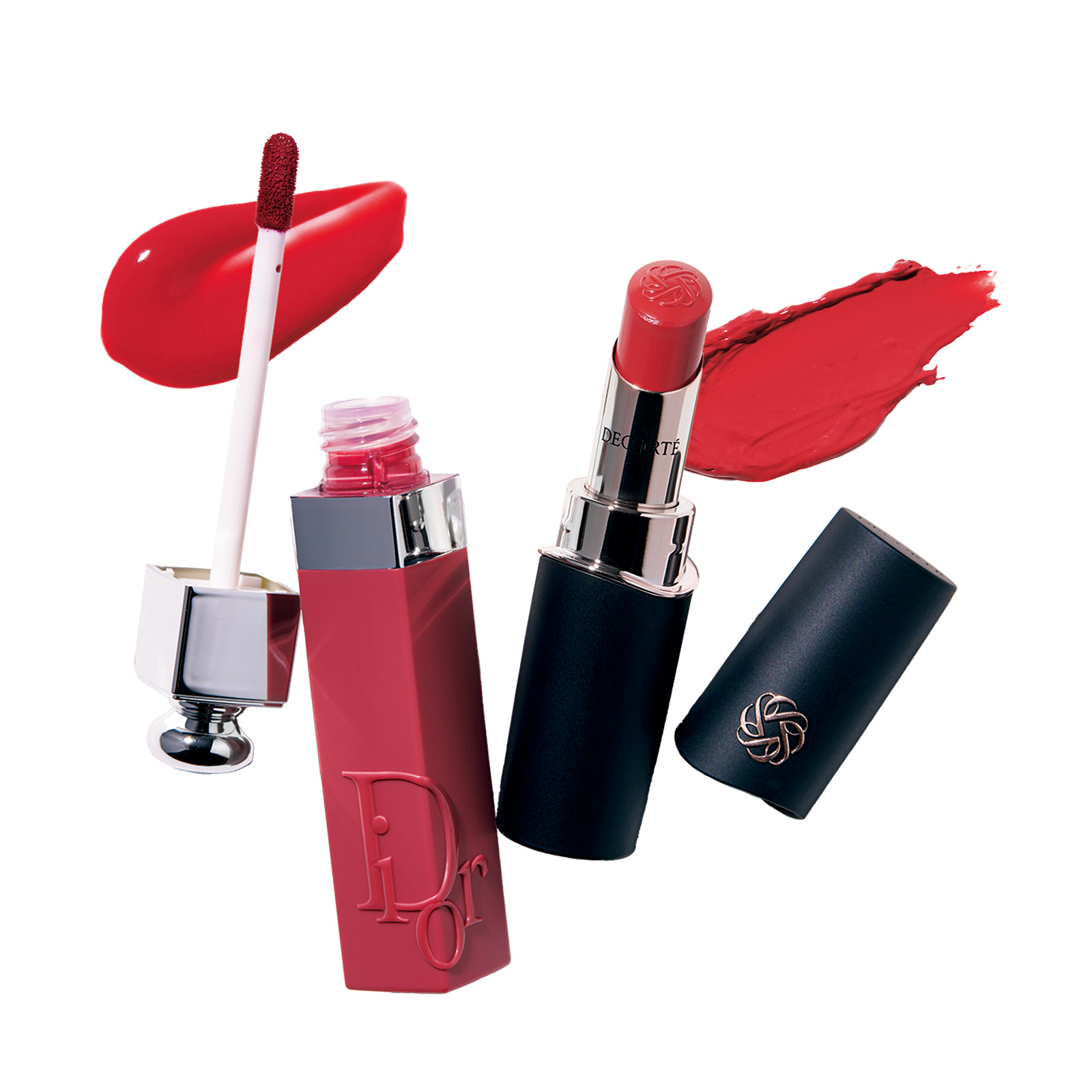 左・水のように軽くて乾かないティントリップ。351はナチュラルな血色感が絶妙。¥4,730(パルファン・クリスチャン・ディオール) 右・唇にのせた瞬間、体温でとろけるようにフィットするクリーミーな質感で大人気。血色感のあるローズカラー。¥5,500(コスメデコルテ)