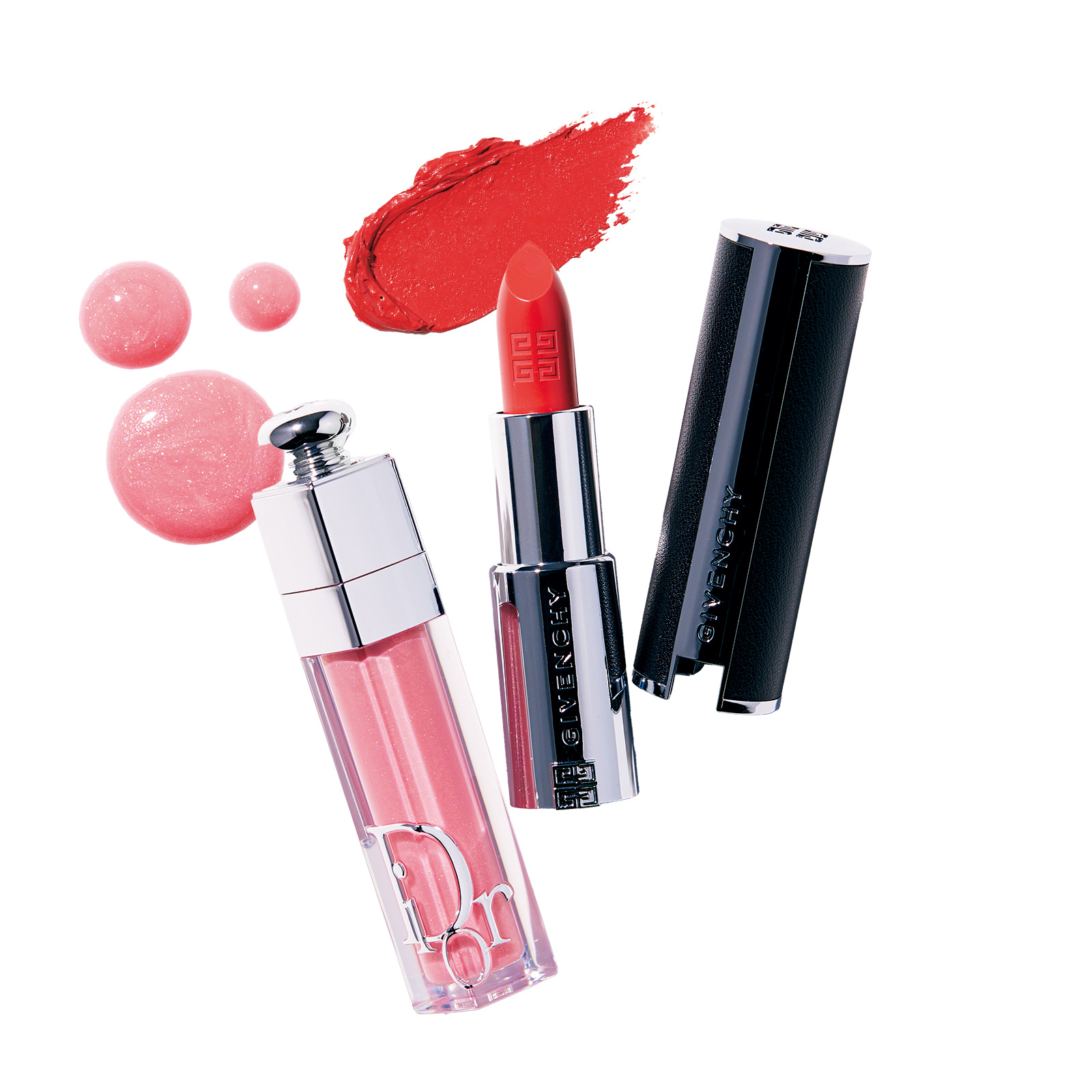 左・上質な輝きとふっくらとしたボリューム感で絶大な人気。大人かわいいシアーピンク。¥4,730(パルファン・クリスチャン・ディオール) 右・ピタッと薄く唇に密着。ラグジュアリーなコーラルベージュ。¥5,940(パルファム ジバンシイ)