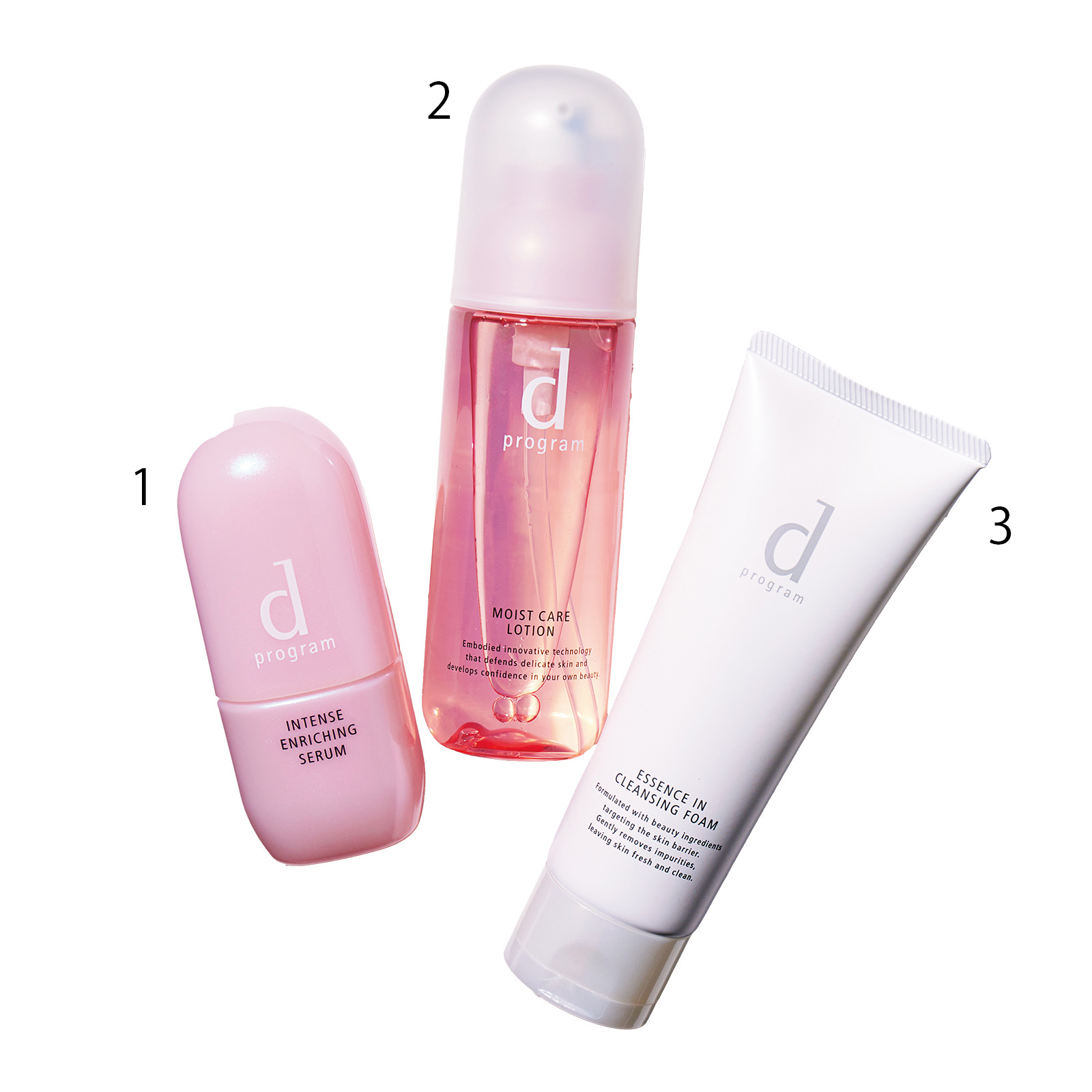 1:繰り返す乾燥トラブルに美容液。45㎖¥4,400 2:潤いに満ちたなめらか美肌へ導く化粧水。125㎖¥3,740 3:優しく潤いを守りながら汚れを洗い流す洗顔。120g¥2,090〈すべて医薬部外品〉(すべて資生堂)
