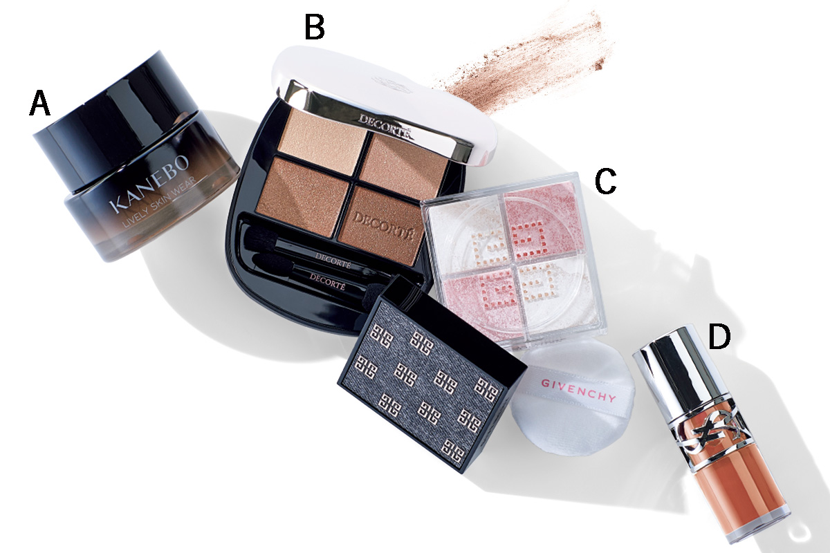 ブラウンシャドウが主役のメイクは、クリームファンデーションで端整な肌に整えておくと品よく仕上がる。ハイライトチークでみずみずしさを。リップはブラウンと好相性の艶やかなコーラル。