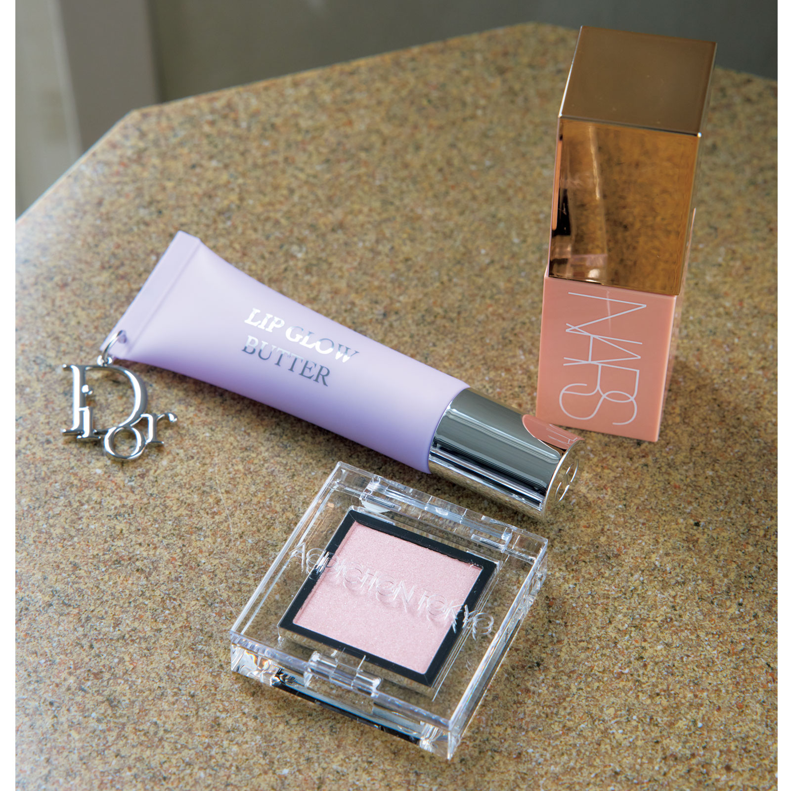大人可愛く見えるキラキラ&ツヤが仕込めるコスメがこの夏活躍。奥から/NARS アフターグロー リキッドブラッシュ 02799 ¥4,840(NARS JAPAN)ディオール アディクト リップ グロウ バター 102 ¥5,060(パルファン・クリスチャン・ディオール) ザ アイシャドウ プリズム 102PR ※オンライン限定 ¥2,530(ADDICTION)