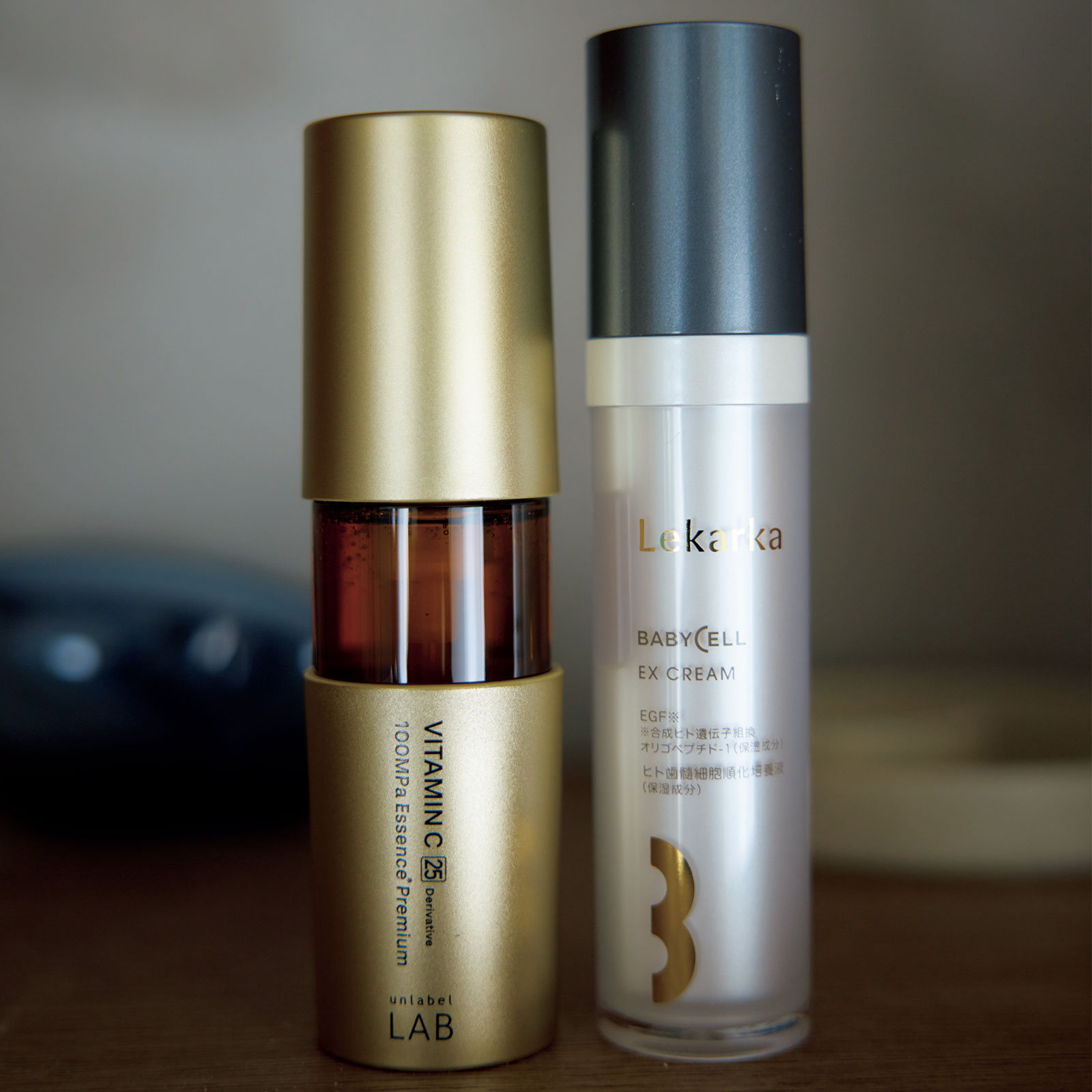 肌馴染みがいいヒト幹クリームは、乾燥が気になる目周りに。夏は紫外線を浴びがちなのでコスパ◎な、美容成分入りセラムを腕までたっぷり使います。左/アンレーベル ラボ V エッセンスプレミアム 50ml ¥2,970(JPSLAB)右/EXクリーム 30g ¥16,500(レカルカ)