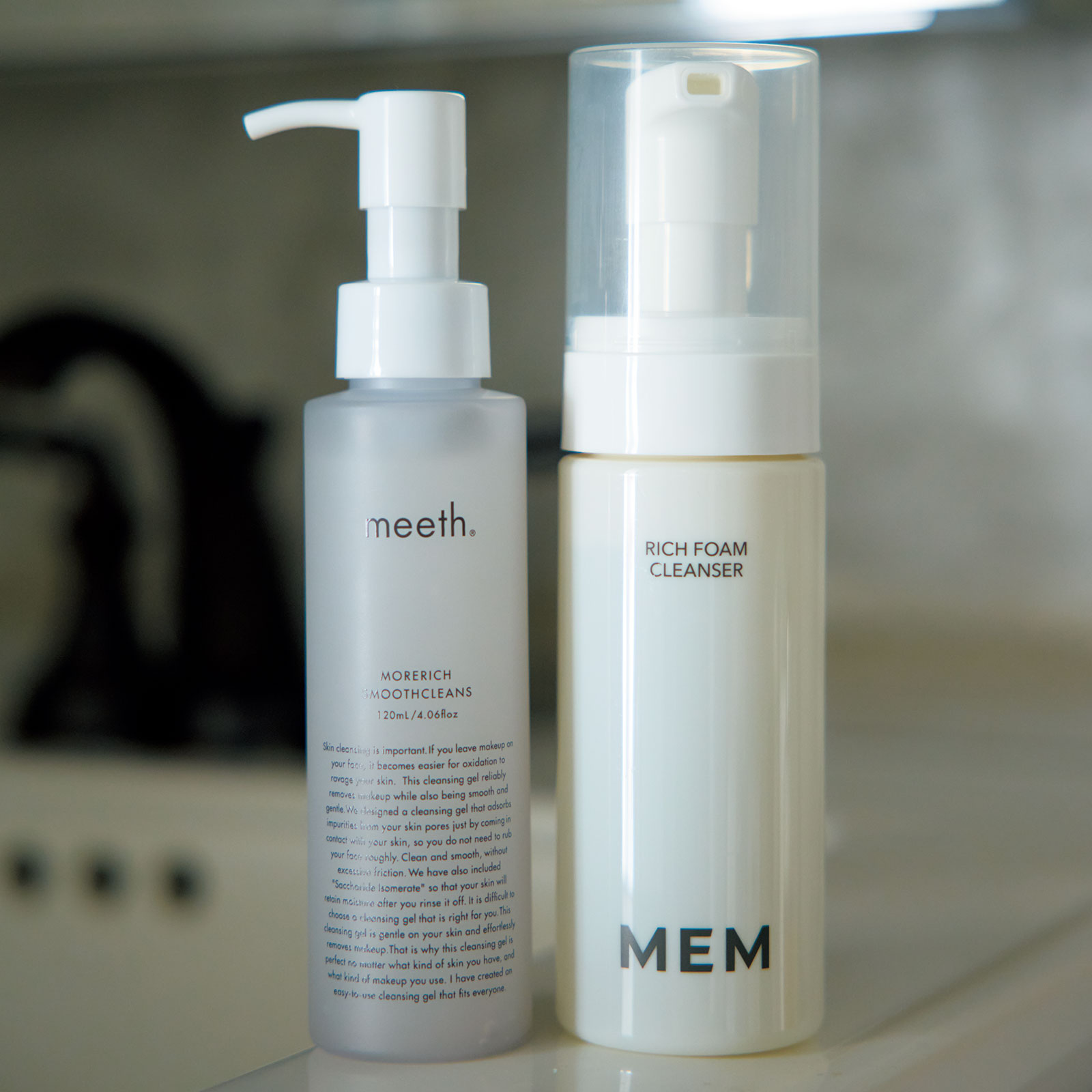 皮脂分泌が多い夏はさっぱり洗えて、潤う洗顔を。MEMは2種のセラミド様成分配合で洗顔後のお肌がしっとり。meethは肌の潤いを守る洗浄成分へのこだわりが凄い!左/モアリッチスムースクレンズ 120ml ¥4,950(meeth)右/リッチ フォーム クレンザー 150ml ¥4,620(MEM)