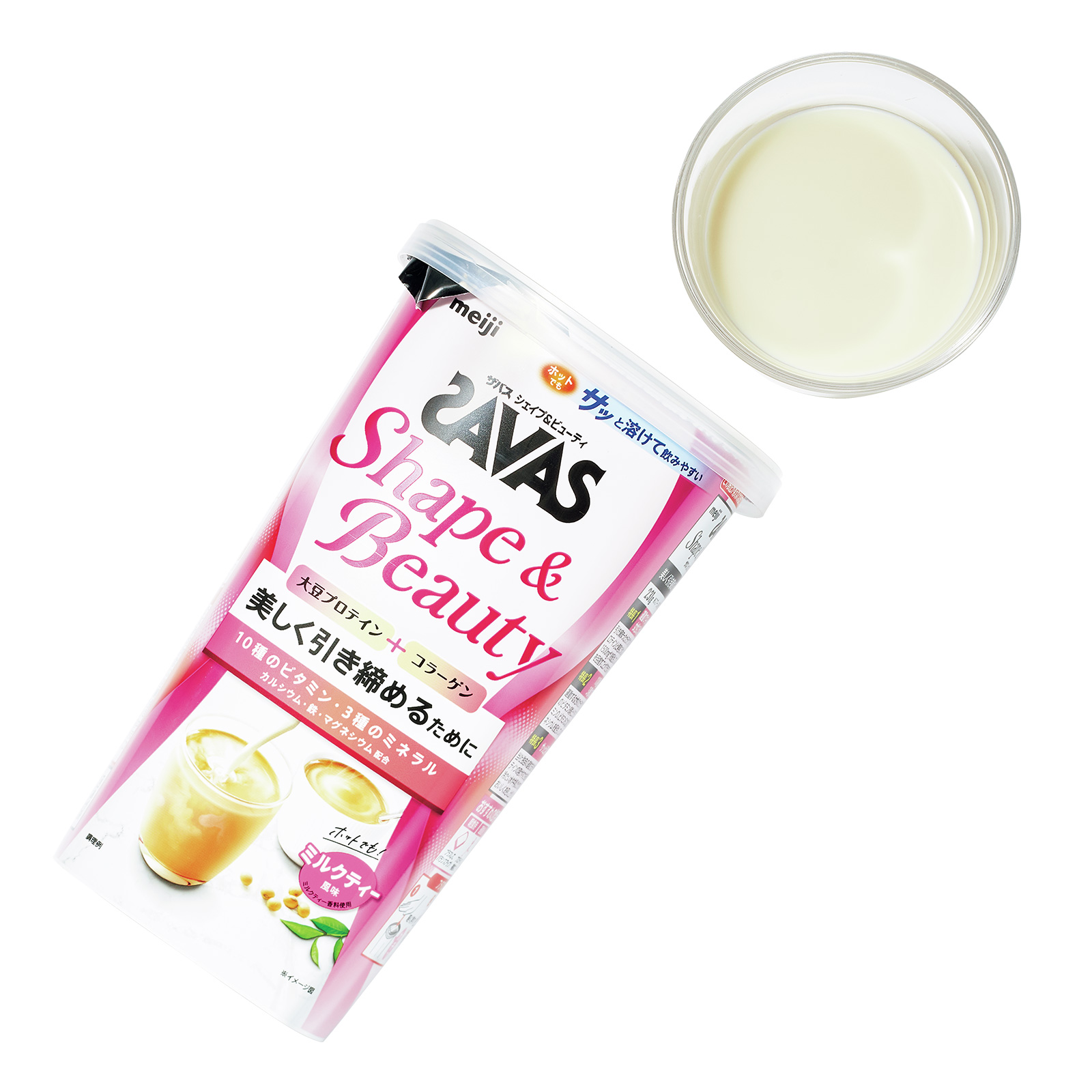 大豆プロテインと鉄、コラーゲン配合の女性のためのプロテイン。夏のカラダに自信を。ザバス シェイプ&ビューティ ミルクティー風味 231g ¥1,782〈編集部調べ〉(明治)
