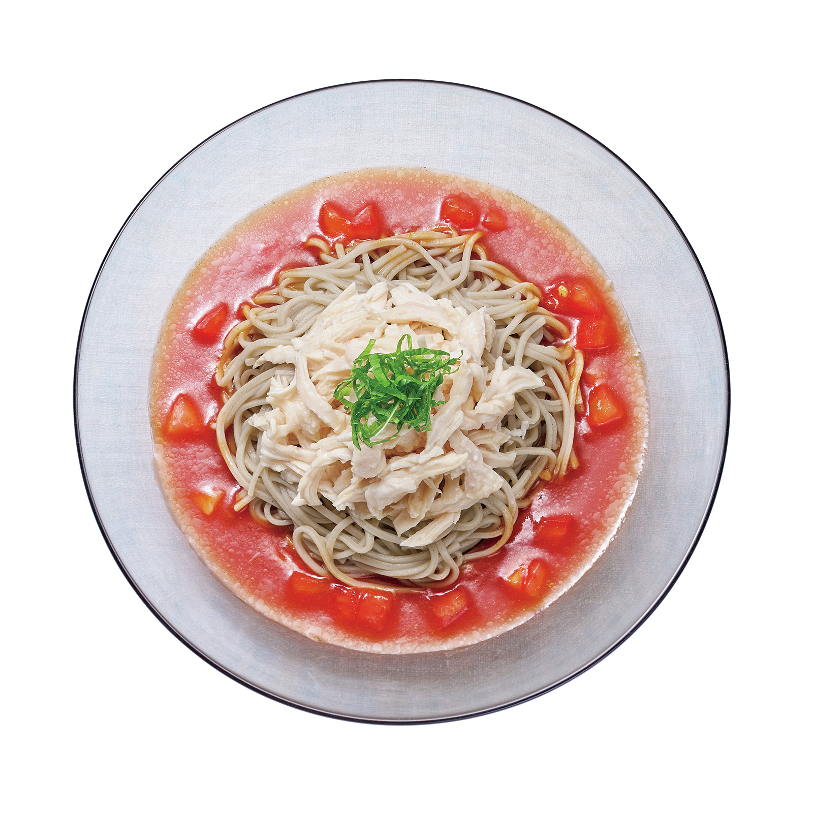 トマトのリコピンをチャージ!(2人分)❶耐熱皿にささみ3本を並べ塩と酒をふりフォークで穴をあける。ラップをしてレンジで2分加熱。粗熱が取れたらほぐす。しそ2枚は千切りに。❷トマト1/4個は7㎜角に切りトマトジュース1カップ・めんつゆ(3倍濃縮)1/4カップ・カレー粉小さじ1・ごま油小さじ2と混ぜる。❸そば(乾麺)2束は袋の表示通り茹で、流水にさらし水気を切る。❹麺に①をのせ②をかける。
