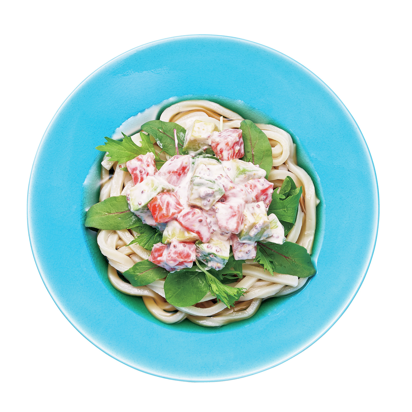 最強美容食材のサーモンはアスタキサンチンで抗酸化! アボカドの良質な油を組み合わせて。(2人分)❶サーモンさく(刺身用140g)とアボカド1/2個は1㎝角に切り、ギリシャヨーグルト40g・粒マスタード小さじ2・塩一つまみを加え和える。❷冷凍うどん2玉は袋の表示通り加熱し、冷水でしめて水気を切る。❸うどんにベビーリーフ30g、①をのせ、めんつゆ(3倍濃縮)1/4カップ・水1/2カップを合わせたものをかける。