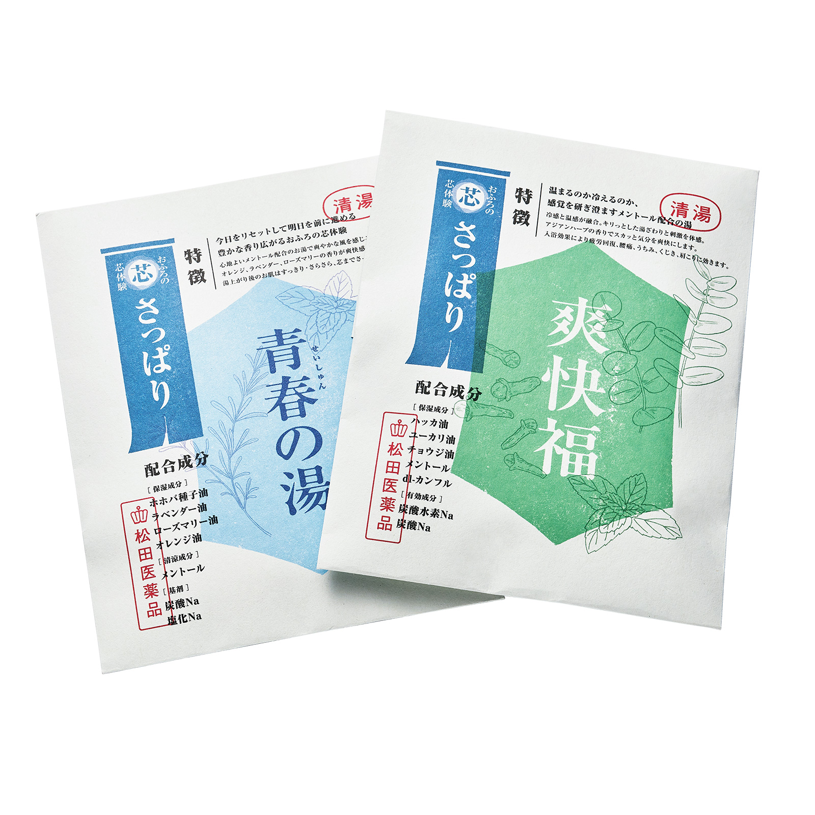 左・オレンジ、ラベンダー、ローズマリーの香り。青春の湯 1包 ¥308 右・白濁色のお湯。爽快福 1包 ¥352(ともに松田医薬品)