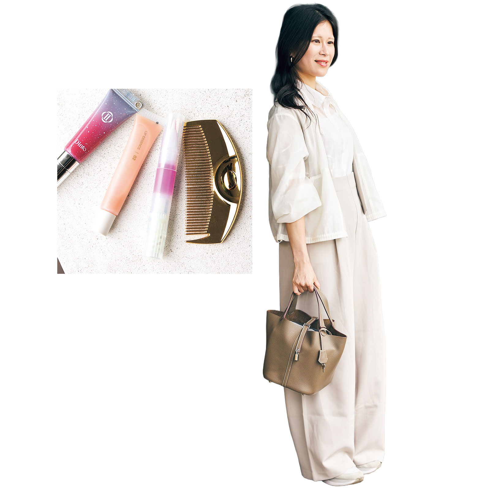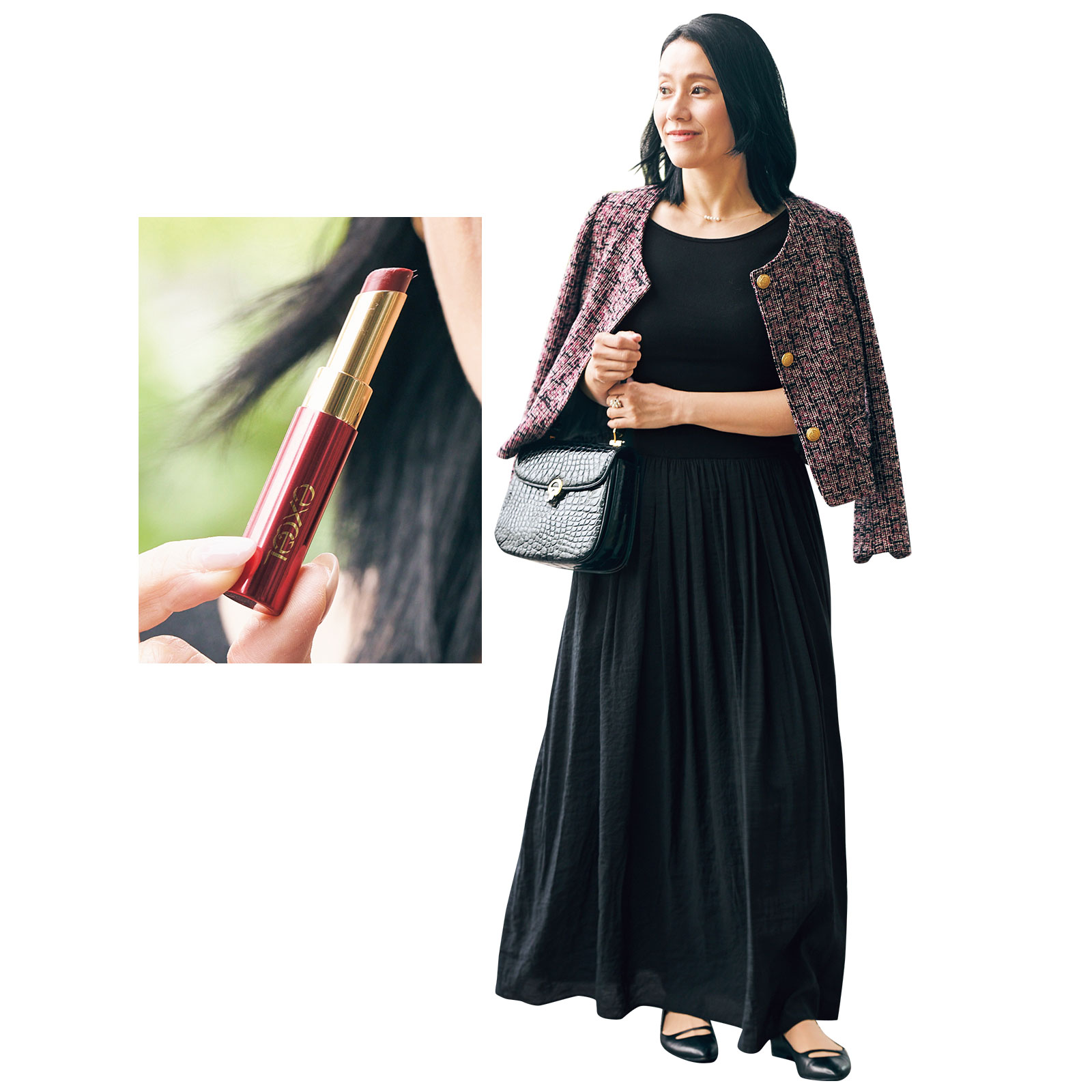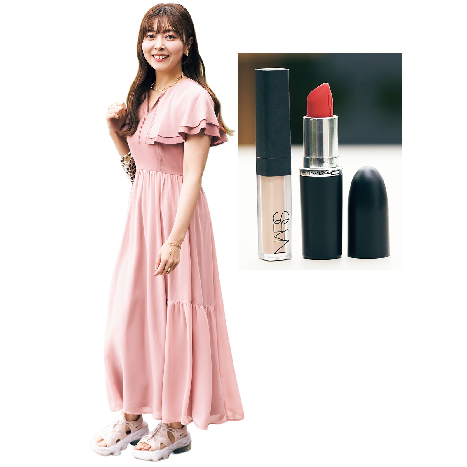 クールなシンプルメイクが好みだから、肌も目元も作り込まず、色もナチュラルカラーを選んでいます。唇に色がないと不健康に見えるので、エクセル リップナイズド LN 04を薄く塗って血色感を演出。透け感のあるローズピンクのツヤが長時間持続してくれます。