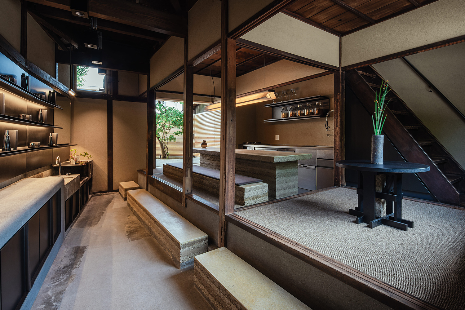 「FAS」の旗艦店となる京都東山店は、まちの喧騒から離れた一角に位置する、100年近い歴史をもつ一軒家をリノベーションしたもの。庭には日本の伝統工法である洗い出し式の床を採用。様々なアート作品を楽しみながら、一階のカフェでは「FAS」のブランドコンセプトである「発酵」や、「FAS」の故郷である京都の地で生み出される原料に由来したお菓子やお飲み物を提供しています。