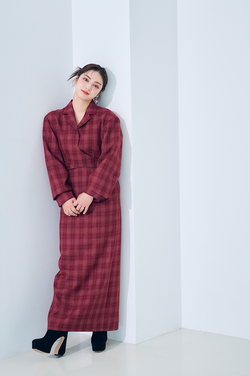 ドレス ¥27,500(Ameri) ブーツ ¥157,300 (sergio rossi) ピアス ¥23,100 リング(右手薬指) ¥36,300 リング(左手中指) ¥59,400(すべてe.m.) 他 スタイリスト私物