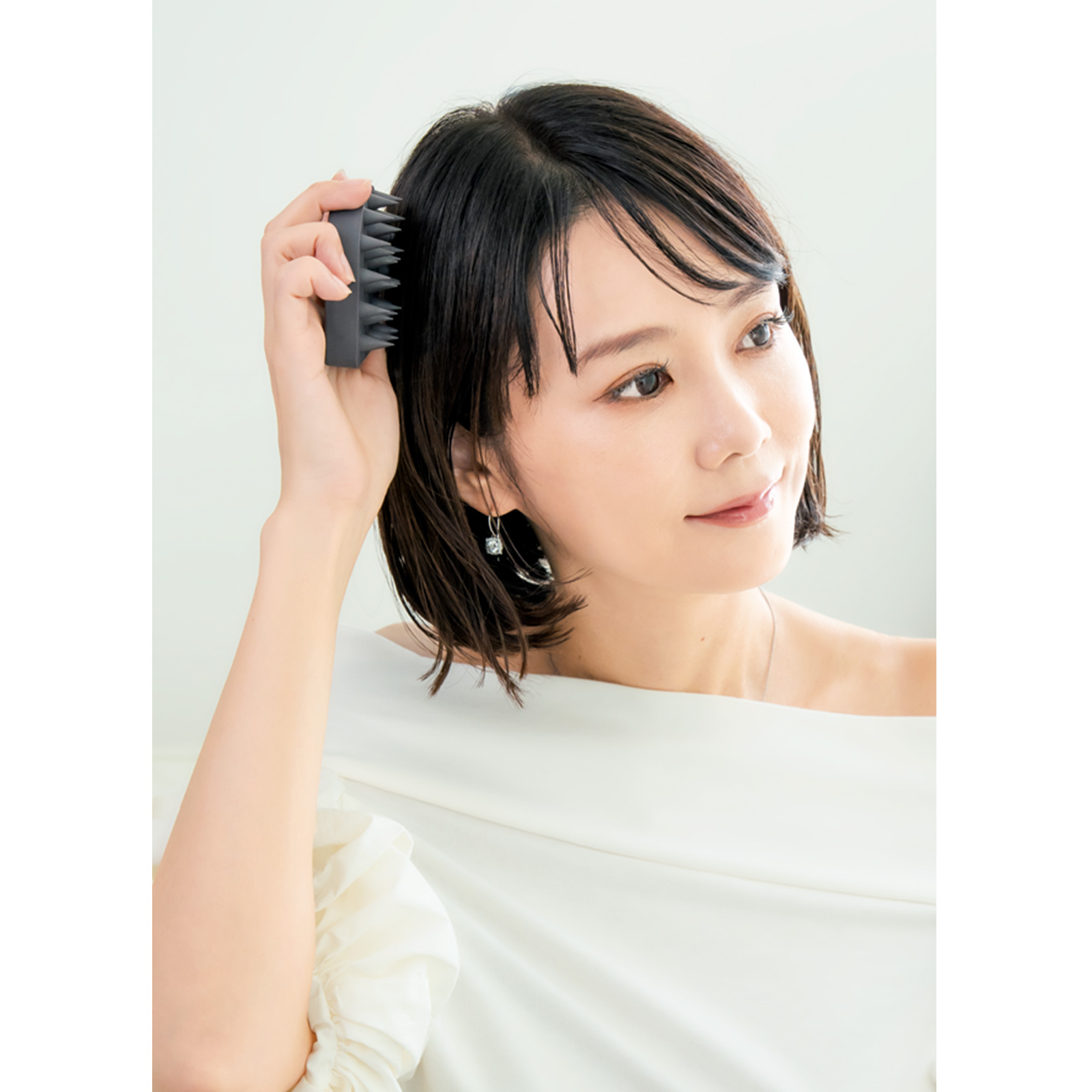 エトヴォスの硬めブラシで気づいたときにぐりぐり。テレビを見ながらや移動中など、髪が濡れていても乾いていても使えるのが◎。むくみがなくなり、輪郭が復活!