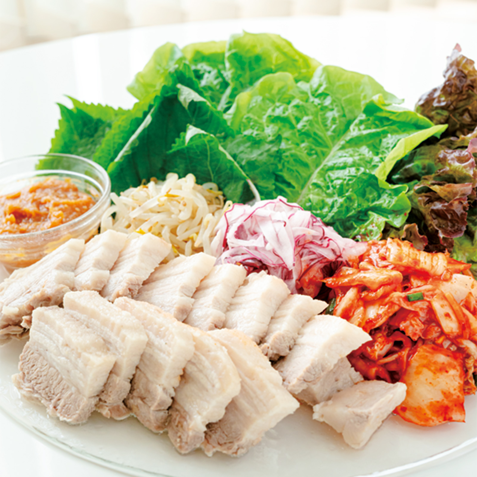 乳酸菌豊富なキムチ×βカロテンたっぷりのエゴマを組み合わせた、内側からキレイになれる定番ごはん。豚肉をしっとりゆでて、エゴマやサンチュで巻き、ピリ辛味噌ダレとともに。たんぱく質・食物繊維・ビタミンが一度にとれるバランスの良さに加え、冷蔵庫にあるものでアレンジも自在。美味しいうえに満足感たっぷりの、食べるスキンケア!