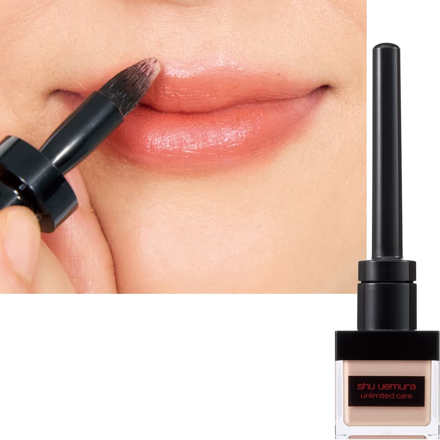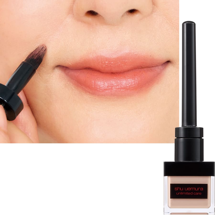さりげないツヤ感を与え、肌をふっくらと美しく見せてくれるハイライター。使うのは、上唇の山、下唇の中央のアウトライン、口角、法令線の影になっている部分へ。筆でさっと少量を入れるだけで、口まわりの影が消え、唇がふっくらと見えます。コンシーラーで隠すより、より軽やかに仕上がる“光で飛ばす”リキッドハイライターがおすすめ。アンリミテッド ケア ツヤ ドロップ サクラ ピンク ¥7,260(シュウ ウエムラ)※9/5発売