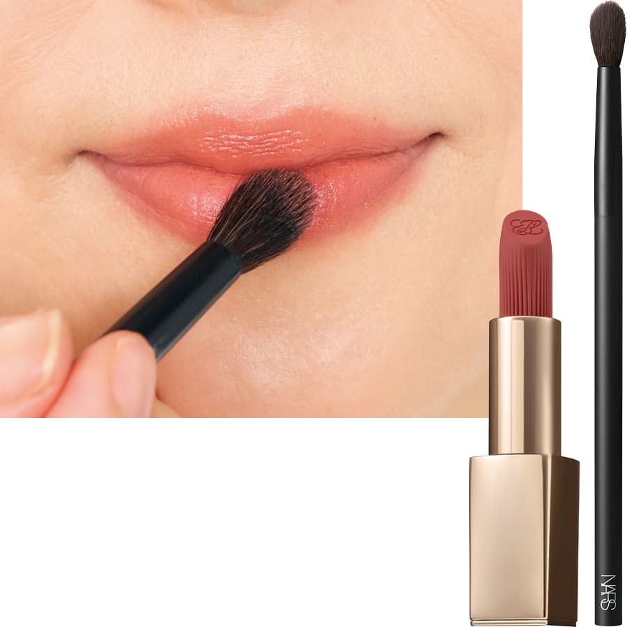 描いたラインの内側に、肌馴染みのよいオレンジ系マットリップを仕込みます。毛量が多く肉厚なブラシでトントンと重ねると、パウダリーで柔らかな印象に。リップブラシで塗るよりも繊細に柔らかく唇に馴染み、シワにも入り込みにくいので美しい仕上がりに。左:ピュア カラー リップスティック ウィスパー マット 136 ¥5,720(エスティ ローダー)※数量限定、右:NARS ブレンディングブラシ #22 ¥4,510(NARS JAPAN)