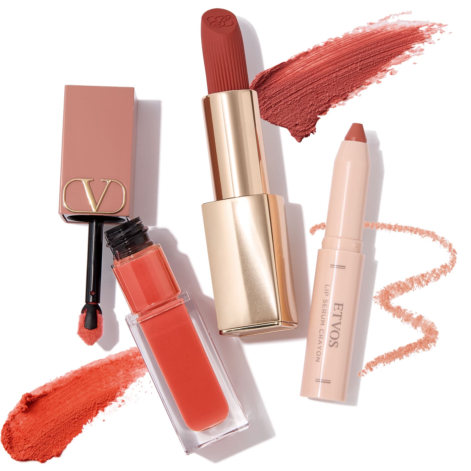 左:唇にも頰にも使えるリキッドマットカラー。ふわっとマットな質感ながら、シアーな発色で肌と唇を品よく彩る。輪郭を描きやすいアプリーケーターも優秀。VALENTINO BEAUTY リキロッソ 409A CORAL SUNSET ¥7,040(ヴァレンティノ ビューティ)中:新質感の軽やかなテクスチャーが唇にふんわり溶け込み、ティッシュオフした直後のような自然な血色感とにじみ感を演出、抜け感のある洗練された口元に。ESTĒE LAUDER ピュア カラー リップスティック ウィスパー マット 136 ギブ ミー ヒント ¥5,720(エスティ ローダー)※数量限定、右:マットなのに潤いを守る処方で、リップクリーム感覚で使え、ラインも描きやすい。肌に馴染む温もりオレンジが、自然な血色感とこなれた印象を演出。ETVOS リップセラムクレヨン オレンジテンポ ¥3,300(エトヴォス)※数量限定